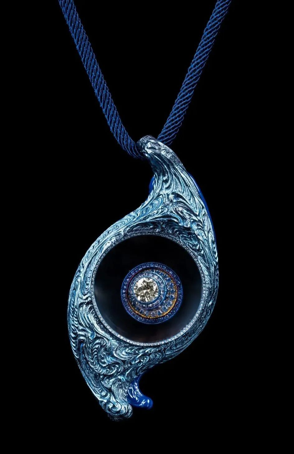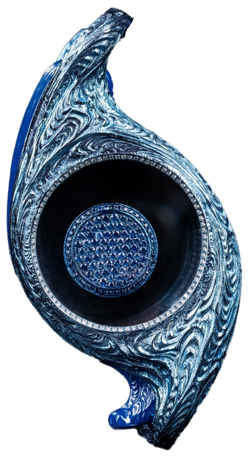 展览通过“雕刻与载体”“混沌与魔法”与“智慧与力量”三个主题呈现,每个主题都代表了通向更高境界的工艺、创造力和意识的探索之路。展陈空间运用不同的色彩和雕塑艺术为过渡手法,基于暗空间为主,结合蓝、红、紫三种不同的色彩语言,以诠释三个展区的参观情感和展品背后的雕刻艺术,同时营造出一种宁静和舒适的观展环境,使观众在欣赏珠宝雕刻艺术的同时,亦能感受到当代艺术带来的愉悦。