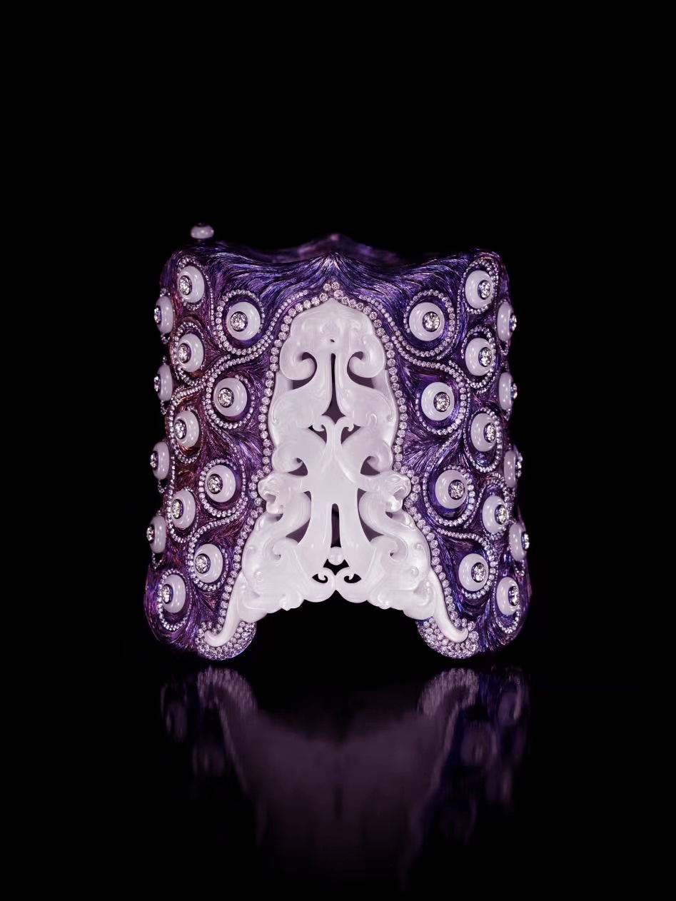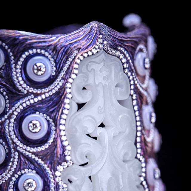 另一件作品《王者归来》已入藏上海博物馆,以羊脂白玉、钻石、钛金属为主材,结合了西方现代绘画的繁星点点和中国战国时期的玉雕工艺。古今兼容,中西并蓄,传神而传奇。温润的白玉与璀璨的钻石形成对比,恰似阴阳互助调和。