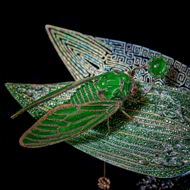 其中,《悟禅知翠》描绘了蝉的启悟。16岁时,陈世英学徒生涯中遇到的第一个难题便是玉蝉。经过40年的修行,他终于在2012年完成了这件作品。蝉在中国文化中象征丰收、高洁和重生。作品中的蝉抱着一颗帝王翡翠,背面镶嵌温润的紫罗兰翠玉,展现了陈世英的翡翠切割润光专利技术。“蝉”与“禅”同音,表达了世间尘俗事需经过智慧沉淀,翡翠象征君子之风,蝉抱之爱之,表示一种境界的追求。