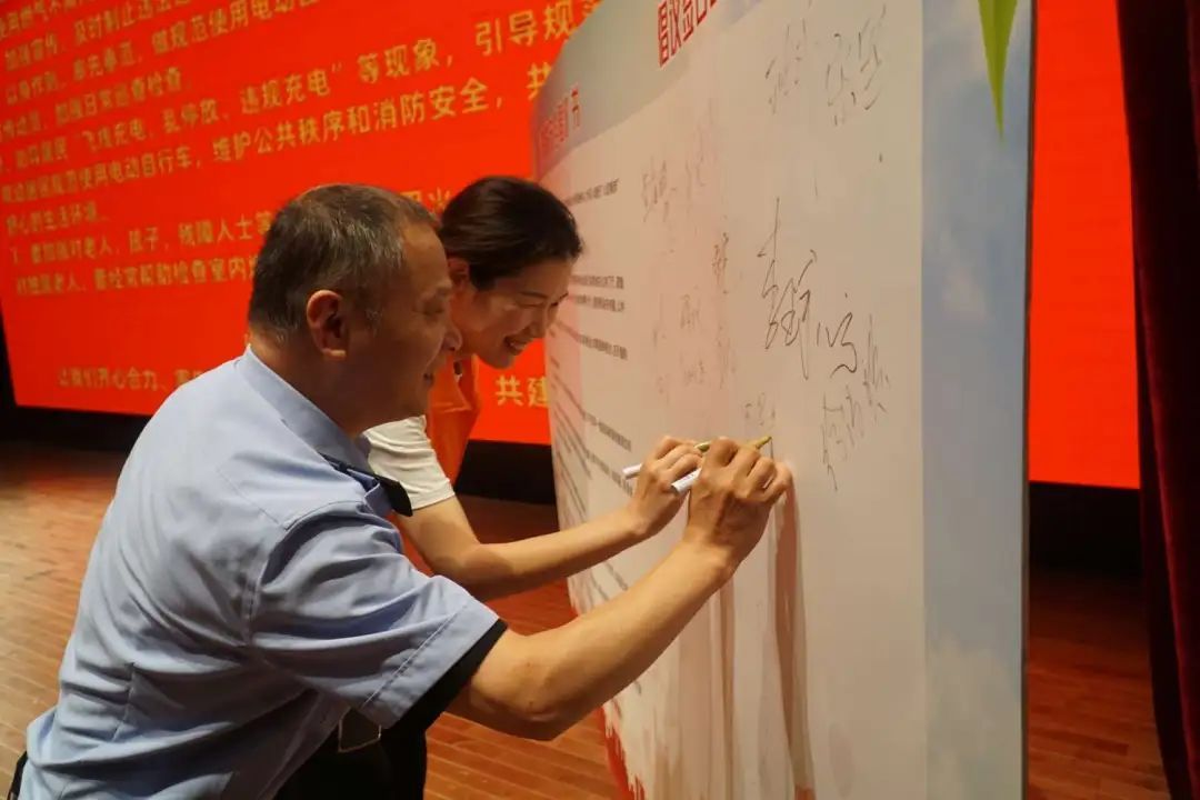 活动中,现场各居民区代表走上台前,在消防安全倡议书下签名,并表示将积极响应倡议书的号召,加强电动车消防安全管理,确保居民区的安全稳定。为进一步加强社区治理,现场,主持人就“社区云”微信小程序的使用方法进行了现场指导,进一步打开居民参与社区发展新活力。