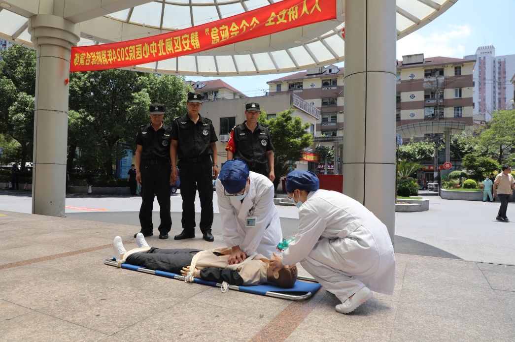 急救演练现场,医疗救护组迅速响应,对伤员进行了心肺复苏、患者转运、急救包扎等急救分诊施救,充分展现了医院应对突发事件的医疗救治综合水平。