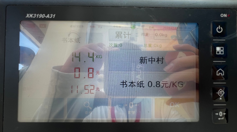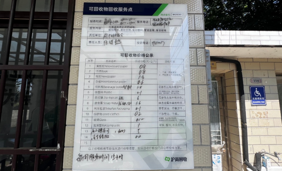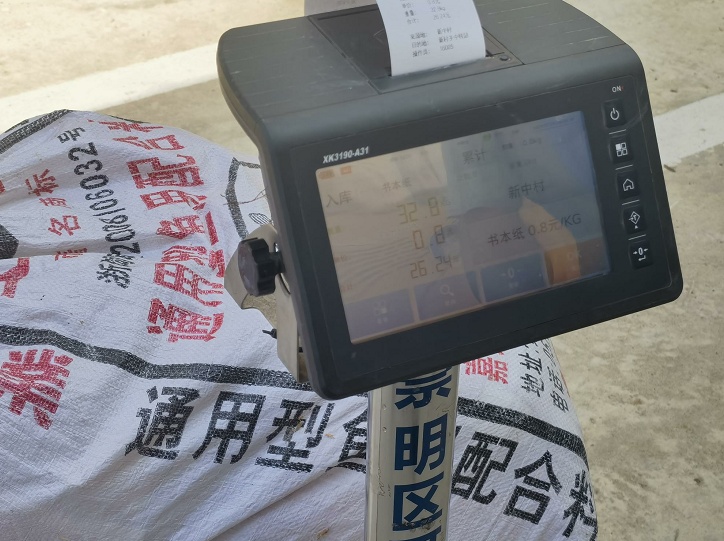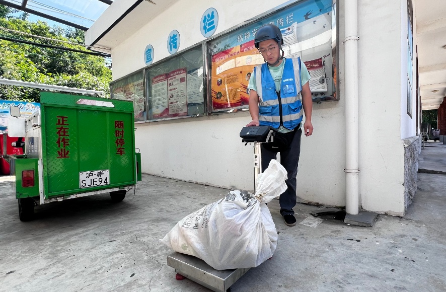“沪尚回收,回收彩电、冰箱、废铁、纸板、泡沫、旧衣服……”7月4日上午,“沪尚回收”服务点工作人员任琪懿骑着车、带着秤,按照约定时间来到新中村村民袁祝明家中,将可回收物分类称好,并将电子秤自动打印出的小票和相应的现金当场交到村民手中。不过5分钟的时间,袁祝明家的废品就“变现”了。“屋里有废品,电话一打就上门来收了,蛮方便的。”袁先生说。