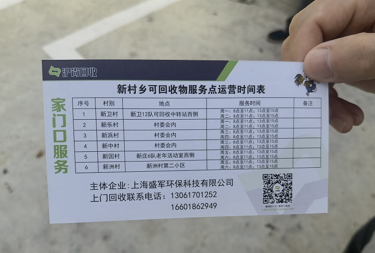 “我们制作了一张便民服务卡,上面印着各类可回收物的参考价格、回收服务点的服务时间,最重要的是上面有预约回收服务的联系电话,发到全乡每一户居民手中。”新村乡生态保护和市容环境事务所所长高磊说,同时要求服务点的工作人员在接到村民电话以后,要约定好上门回收的时间,让老百姓真正能够体会到服务的便利性,让垃圾分类工作更加具有温度。