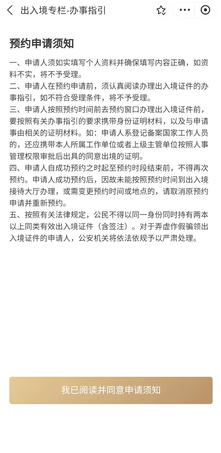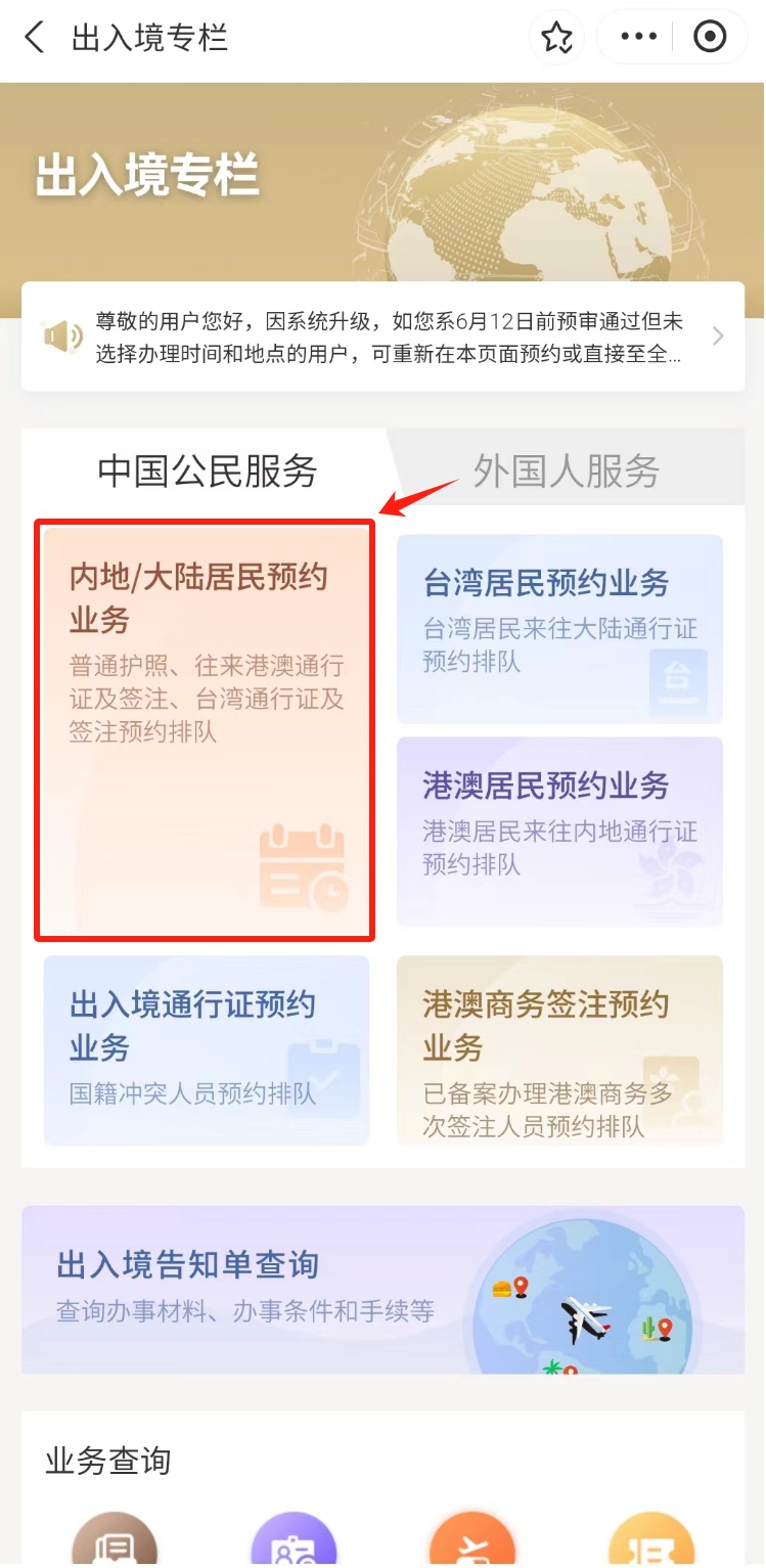 2.以“内地/大陆居民预约业务”为例,在“中国公民服务”栏目中找到对应入口,仔细阅读申请须知后进行办理。