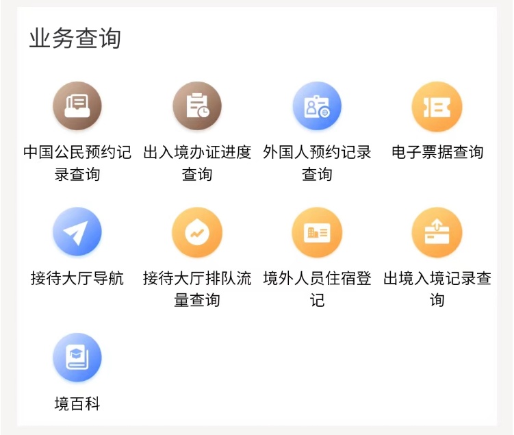 支持快速查询预约记录、各出入境接待大厅实时流量、办证进度、出入境记录、相关政策等信息。