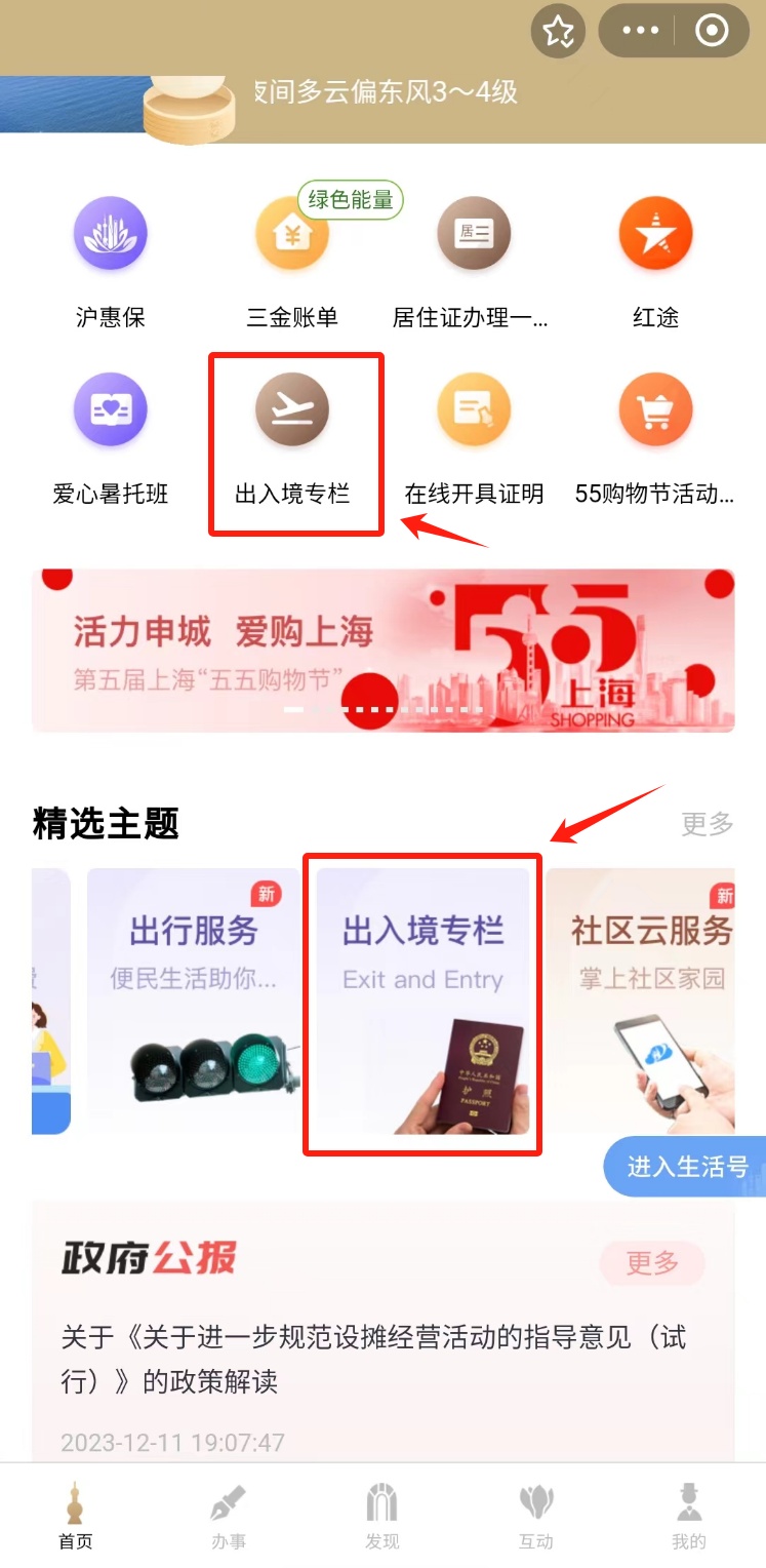 打开“随申办市民云”(支付宝小程序、APP、微信小程序),首页选择“出入境专栏”,或下滑至【精选主题】找到“出入境专栏”,即可进入服务。