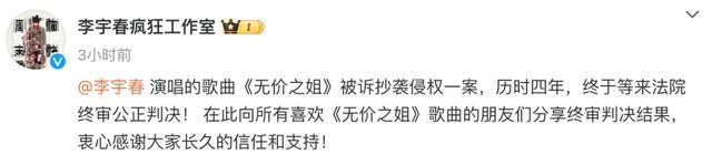 李宇春工作室官方微博随后发文表示:“李宇春演唱的歌曲《无价之姐》被诉抄袭侵权一案,历时四年,终于等来法院终审公正判决!在此向所有喜欢《无价之姐》歌曲的朋友们分享终审判决结果,衷心感谢大家长久的信任和支持”。