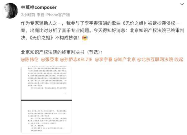 7月8日,作曲家林莫樵在其个人微博晒出李宇春《无价之姐》侵权案终审判决书内容,并表示自己作为专家辅助人之一,参与了李宇春演唱的歌曲《无价之姐》被诉抄袭侵权一案,出庭比对分析了音乐专业问题。