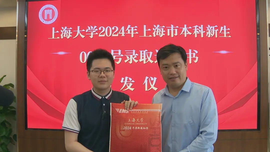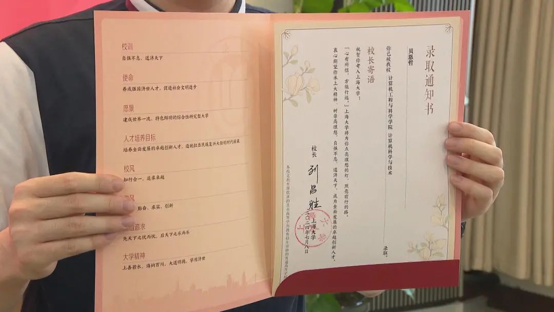 2024高考录取通知书即将陆续发放。黄浦区格致中学学生贝恩哲通过综合评价批次,被上海大学计算机工程与科学学院录取,并幸运地成为编号“0001”的录取通知书获得者。今天上午,通知书颁发仪式在格致中学举行。