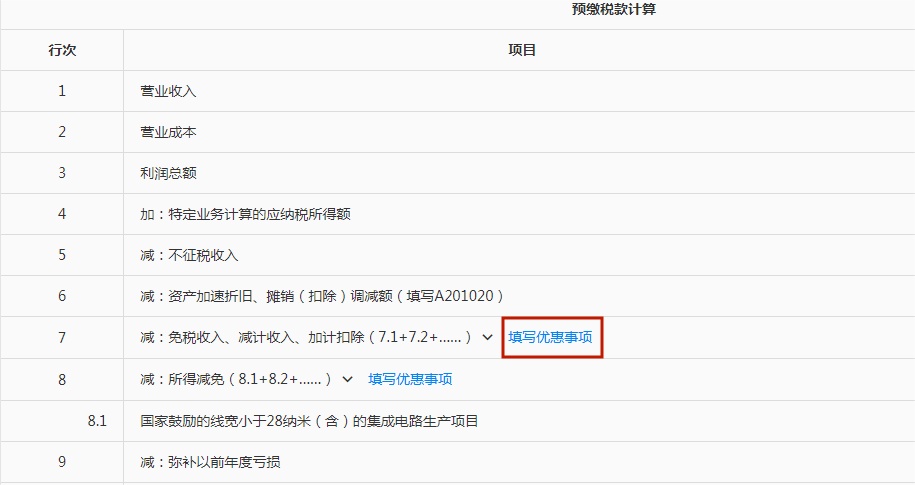 1.企业点击主表第7行“免税收入、减计收入、加计扣除”行次的“填写优惠事项”。