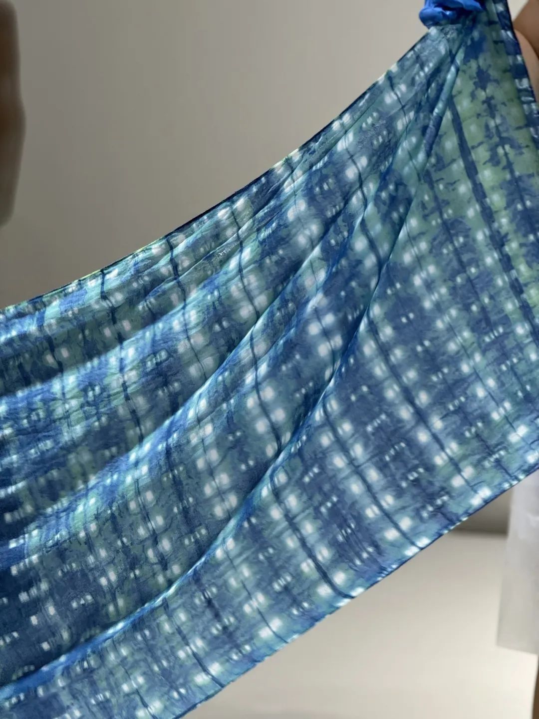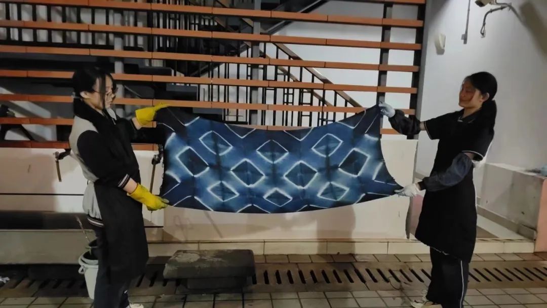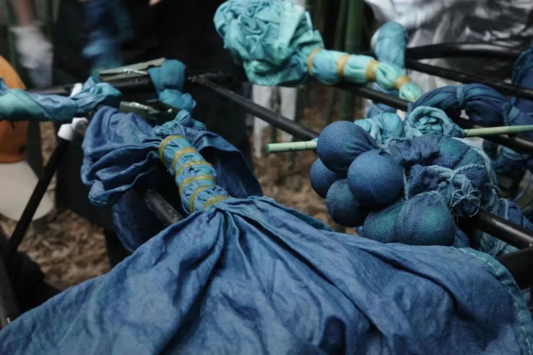扎染的制作过程充满了神秘和偶然性,每一次染色都是一次未知的探索。布料在扎结后浸入染缸,随着染料的渗透和氧化,形成深浅不一、层次丰富的色彩效果。在捞出水面前,很难预估它的最终成色,这种不确定性赋予了扎染作品独特的生命力和艺术价值。