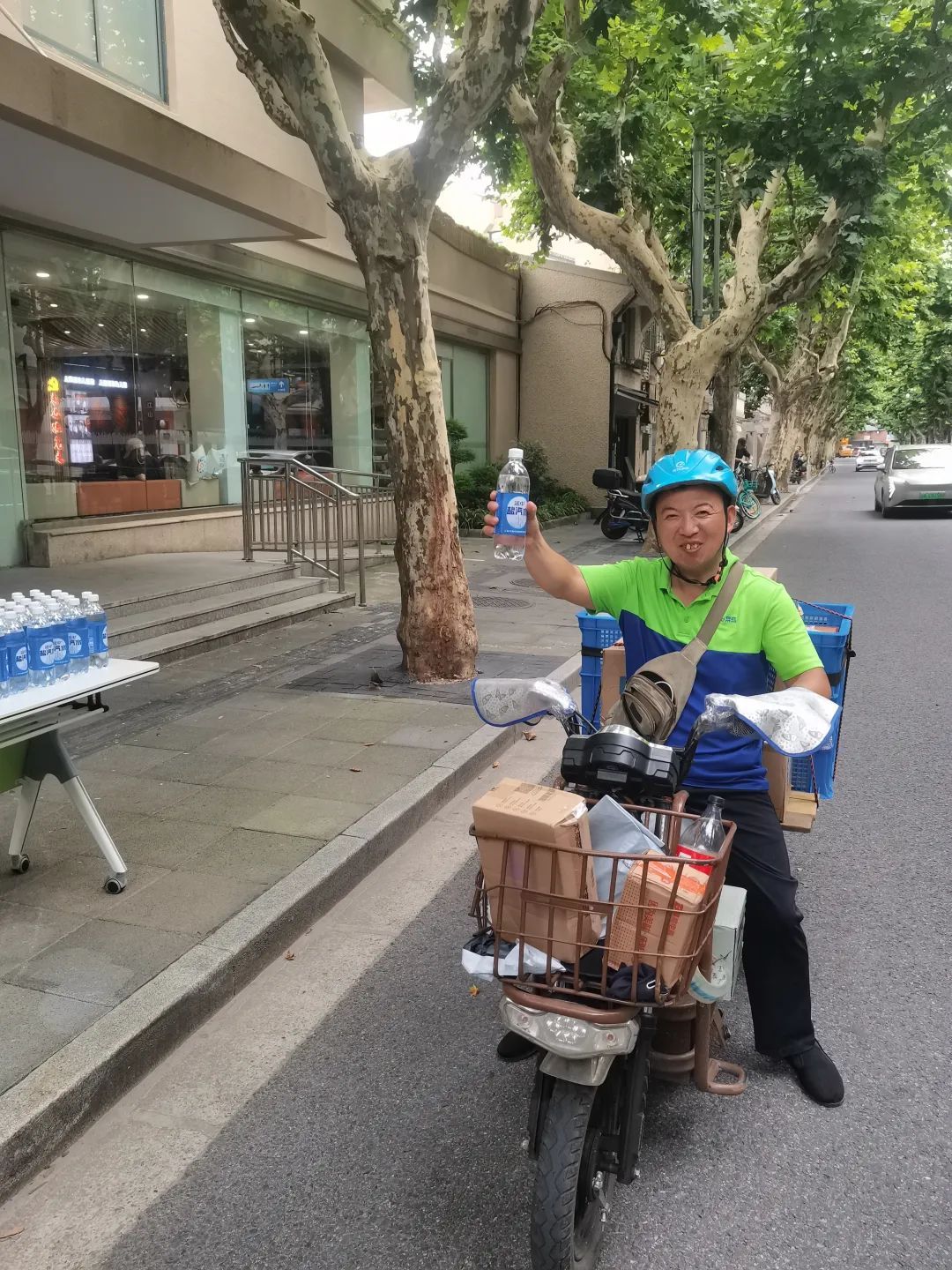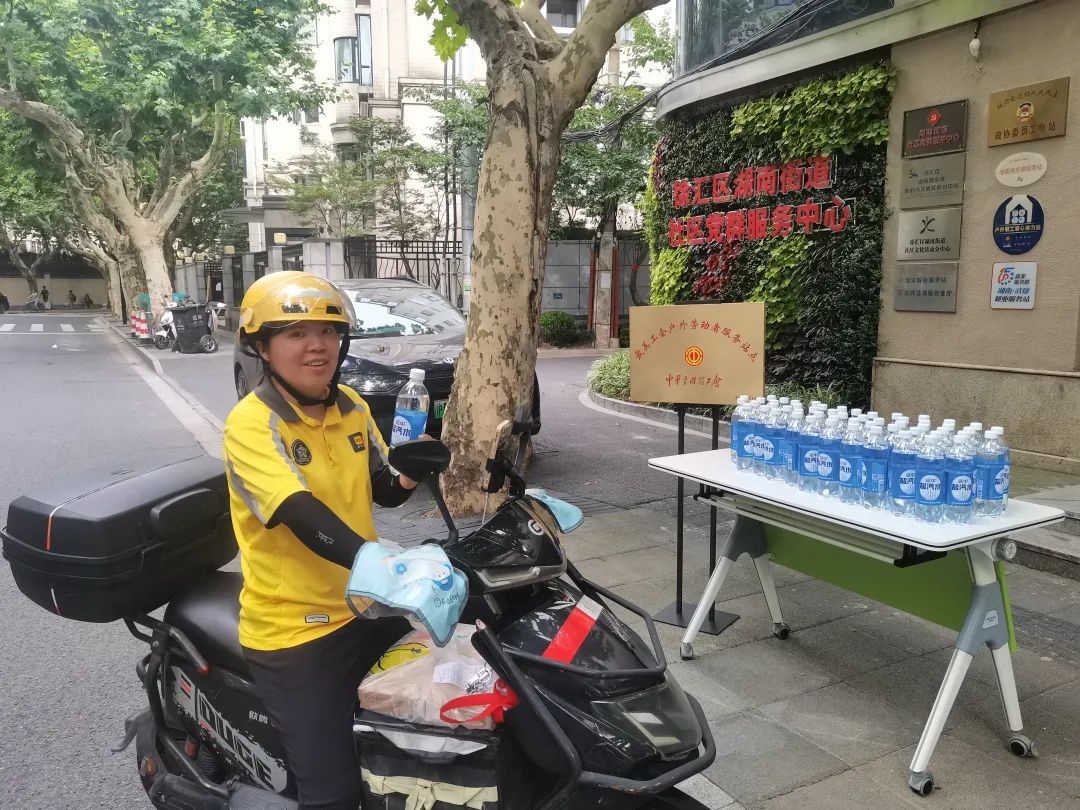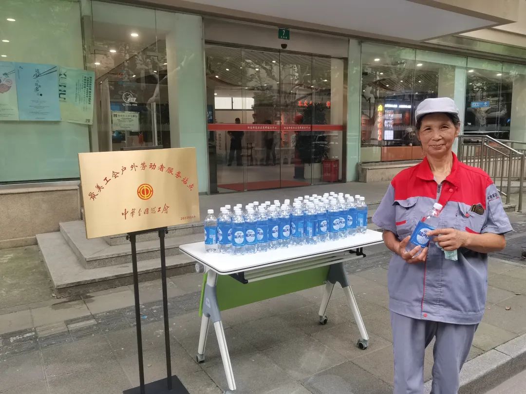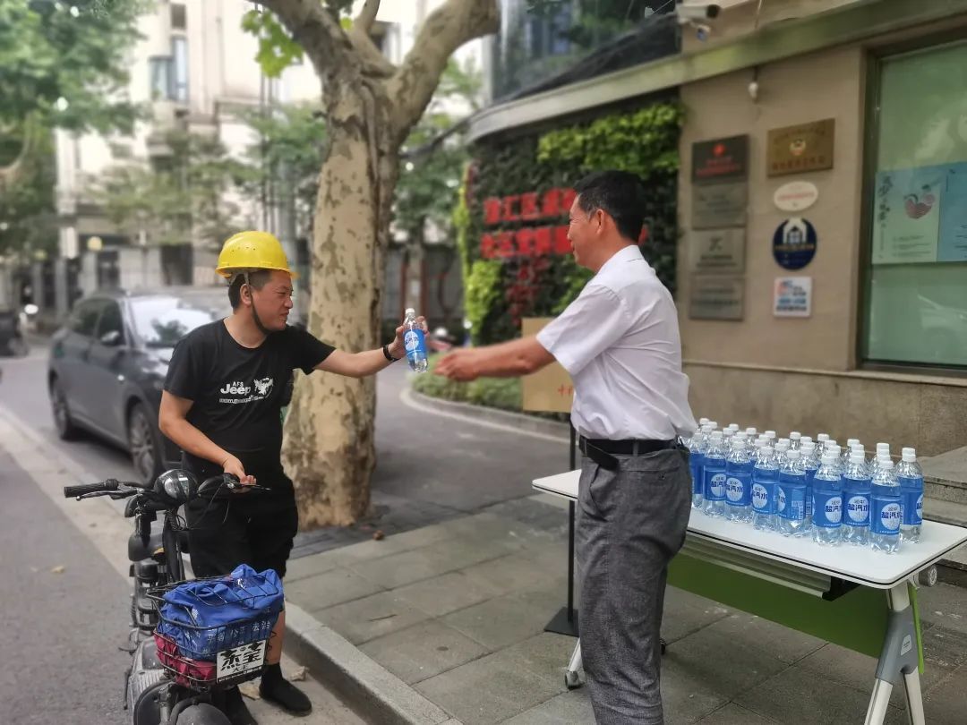“师傅,喝瓶盐汽水吧!里面有空调,能补水、能休息。”这几天,在徐汇区湖南街道高邮路7号党群服务中心门口,满桌的盐汽水被整齐地排放着,一瓶瓶“清凉”被递到了快递小哥、环卫工人的手中。