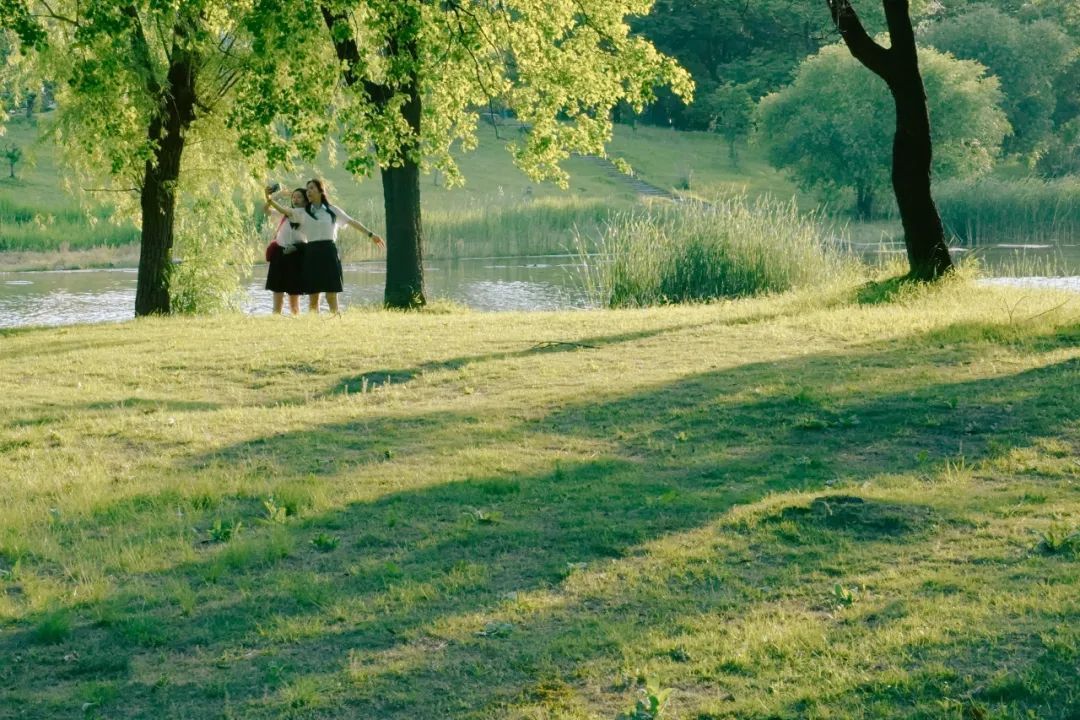 一片片绿茵茵的草坪和苍翠欲滴的树林。