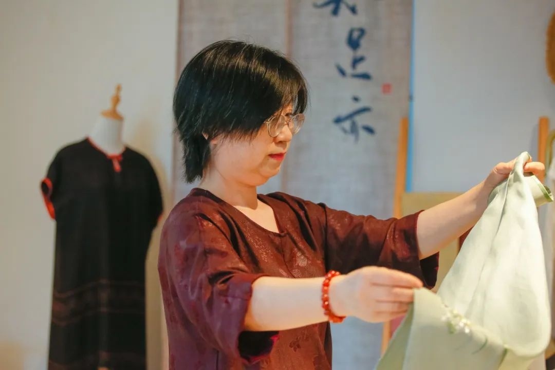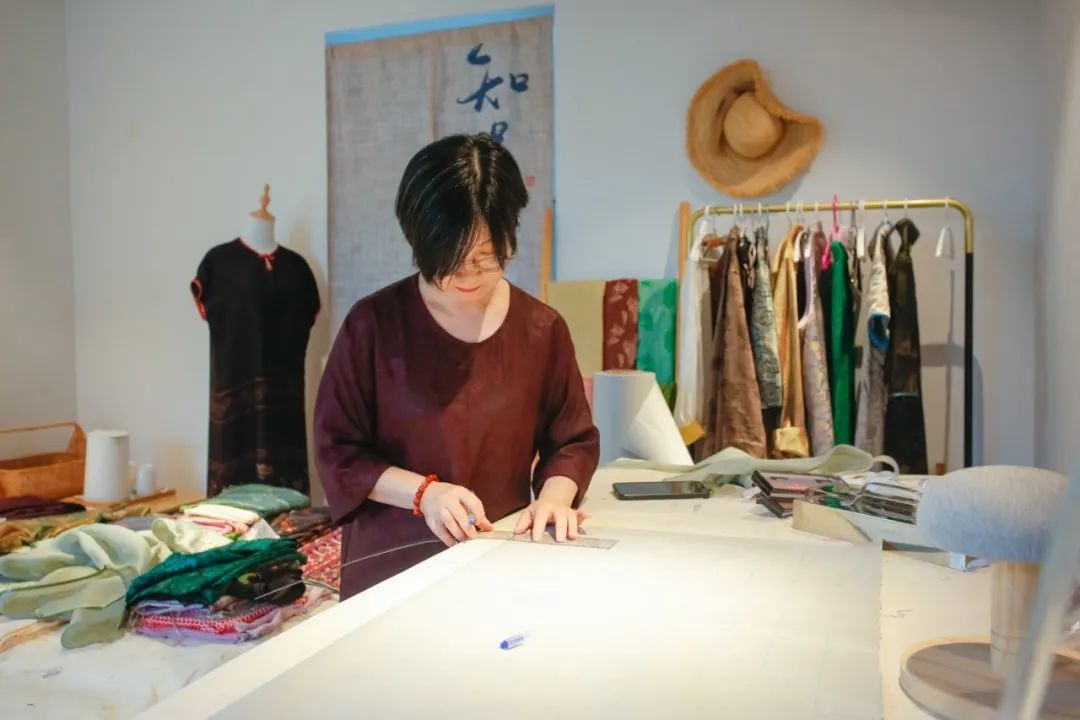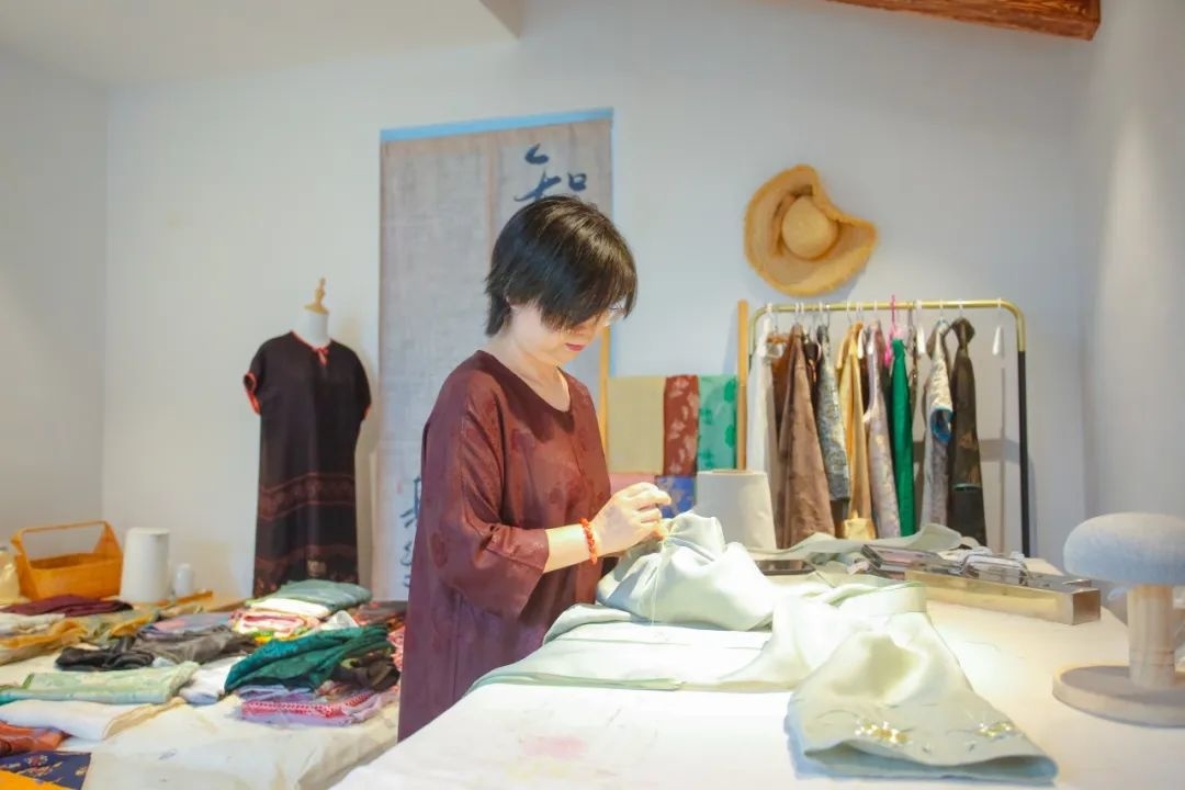 近年来,“新中式”服饰颇为流行,不仅有着较高的辨识度和包容性,还颇具雅韵和传统之美,可以作为通勤穿搭,也能穿着出席各种正式场合。随着“新中式”服装持续走俏、风靡市场,这阵风也同样吹到了金山的海边。 在金山嘴渔村老街的深处,有这样一幢带庭院的三层民宿——九里小院。这里离海边不远,市民游客不仅能吹海风、赏风景、体验海渔文化,还能发现一家“私人定制”的新中式服装工作室。 工作室由民宿一楼的一间客房改造而成,面积不大却内有乾坤,不仅可为客人量体裁衣,还有许多不同的面料可供选择。 走进工作室,制衣台板、缝纫机等摆放有序,一件件定制完成的“新中式”服装和一摞摞的面料更是格外引人注目。工作室主理人张英热情地介绍起了她心爱的面料,“这个是织金缎、这个是正绢、这个是蜀锦、这个是云锦、还有香云纱......你看我身上这件就是香云纱的。香云纱的面料颜色会随着时间增加变得有深有浅,穿上以后就像是独属于你的颜色一样,很有魅力”。 “罗衣何飘飘,轻裾随风还。”宋锦外套、香云纱衬衫、云锦旗袍......一件件定制的服装光摆放在那里就是一种美的享受,不同的款式和设计,可以满足不同年龄段的需求。 从手工制版、裁剪、缝制、滚边,再到熨烫、配上盘扣......漂亮的面料要变身精美的服装,当然离不开一双巧手。工作室内,张英一边流畅地裁剪面料,一边告诉记者,自己其实是自学的裁缝技术,工作室也是退休后才开始运营的。 出于对传统美学的喜爱,作为银行退休职工的张英,就这样通过看书、看视频摸索出了门道。在尝试自己制作了几套衣服,受到了女儿和朋友的认可喜爱后,张英大胆地开了自己的工作室,“谁说退休了就不能有自己的事业了,我现在就要做自己喜欢的东西、做大做强,体验不一样的人生”。 在聊天过程中,张英的工作室迎来了新的客人,在老顾客的口口相传下,张英这间小小的工作室最近逐渐有了些“流量”。每次有客人来,张英就会为她们推荐合适的面料,“不同季节、不同肤色、不同年龄段,都可以选择不同的面料,不同姆米数、不同光泽度做出来的衣服效果都不一样。我希望我的客人都能穿上属于自己的新中式衣服,这就是我的成就感”。 为了让客人选到自己心仪的款式,张英的工作室总是会定期采购新面料,“面料太漂亮了,光放在那里看着,我就很开心。希望通过我的工作室,让每个人都能诠释出自己的‘新中式’风格”。 记者丨朱悦昕 摄影丨金燕玲 通讯员丨王萍 编辑 | 俞岚婷 责编 | 干钰琼 俞岚婷