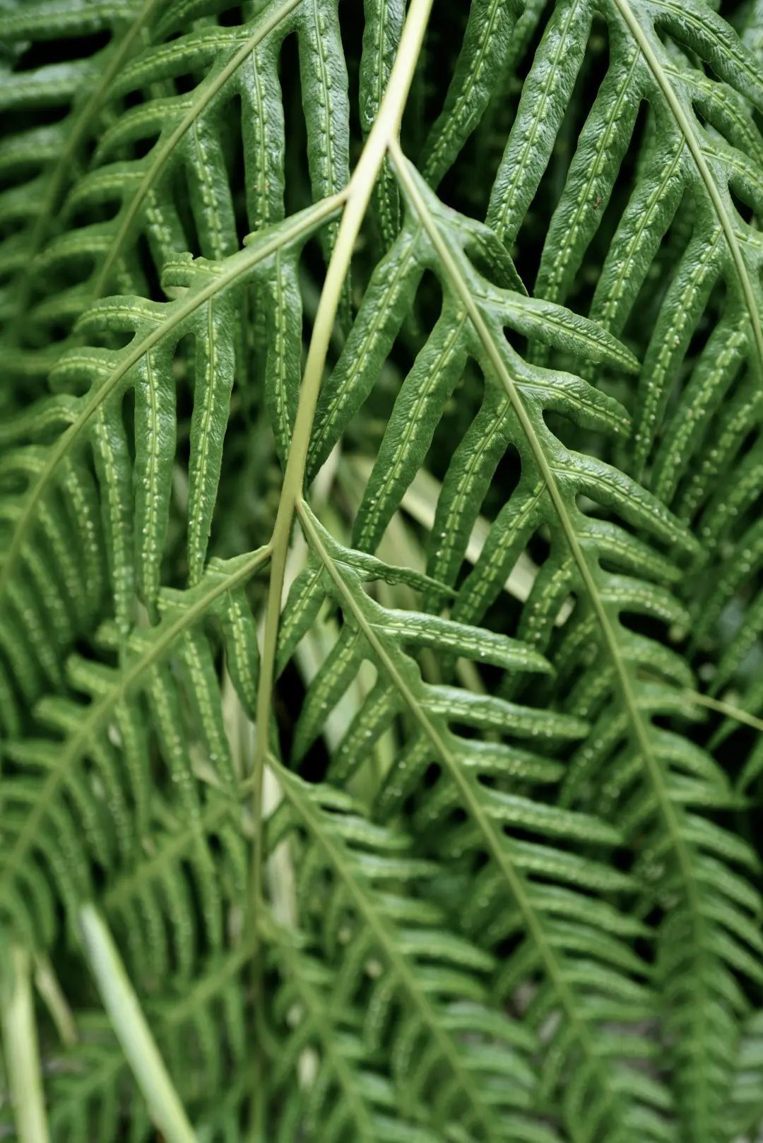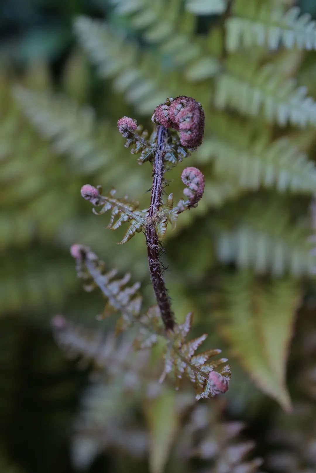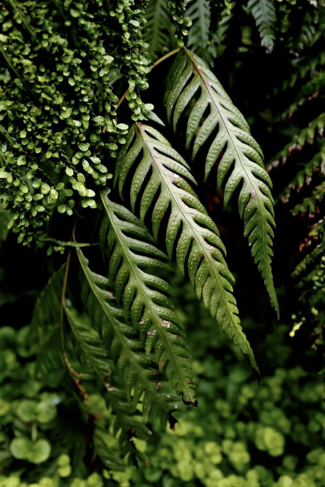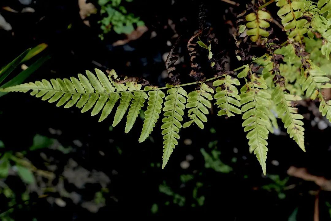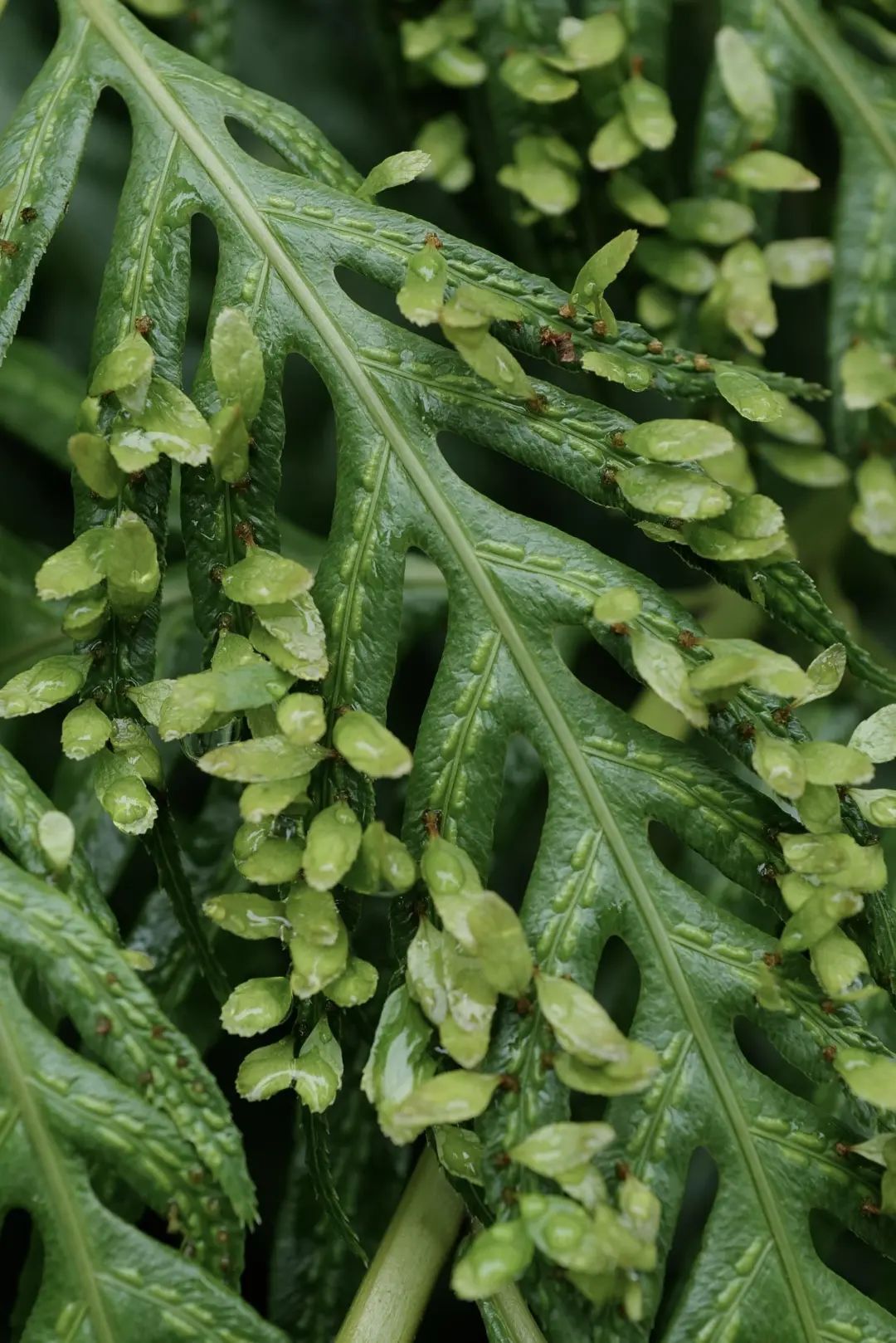 蕨类植物,也称羊齿类植物。它的叶子形态很独特,新生叶子弯曲成羽毛状。它不会开花也不会结果,是靠孢子进行繁殖。孢子囊在叶片表面成群地待着,到成熟时颜色逐渐变成褐色和红色。乍看之下,有点惊悚吓人。而这些密集的小叶片是蕨孢子体的珠芽。