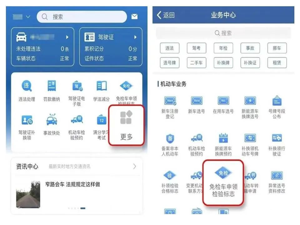 车辆所有人为个人的,可登录“交管12123”手机APP,在“业务中心”—“机动车业务”板块选择“免检车申领检验标志”,根据页面提示操作即可申领。建议选择申领电子标志(不需要纸质凭证,电子标志与纸质凭证具有同等法律效力),系统将自动受理、审核申请信息并核发电子检验标志。