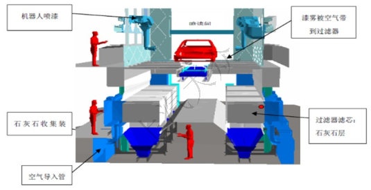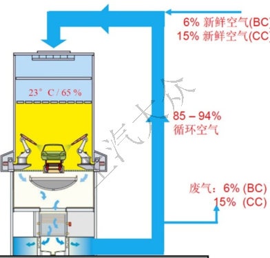 该油漆喷漆室采用循环风利用系统以减少新风供应量,总供风量80%以上可进行循环使用,仅有20%新风的供应和废气的排放,从而降低末端治理设备处理规模和负荷。较传统的100%全新风喷漆室相比,电力消耗降低80%,天然气消耗降低50%。