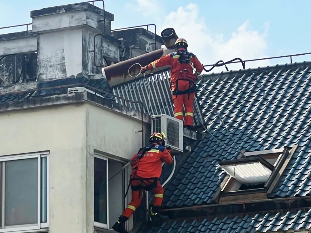 消防员们到达现场后,立即进行了细致评估和处理。他们面对摇摇欲坠的太阳能热水器,利用登高设备和绳索,小心翼翼地靠近。一名消防员负责稳定设备,另一名则手持切割工具,精准地对热水器进行切割和分离。随着一块块沉重的热水器部件被卸下,并安全降落到地面,现场的紧张气氛也得到了缓解。最终,在消防员们的共同努力下,彻底消除了这一安全隐患,为居民们解除了后顾之忧。