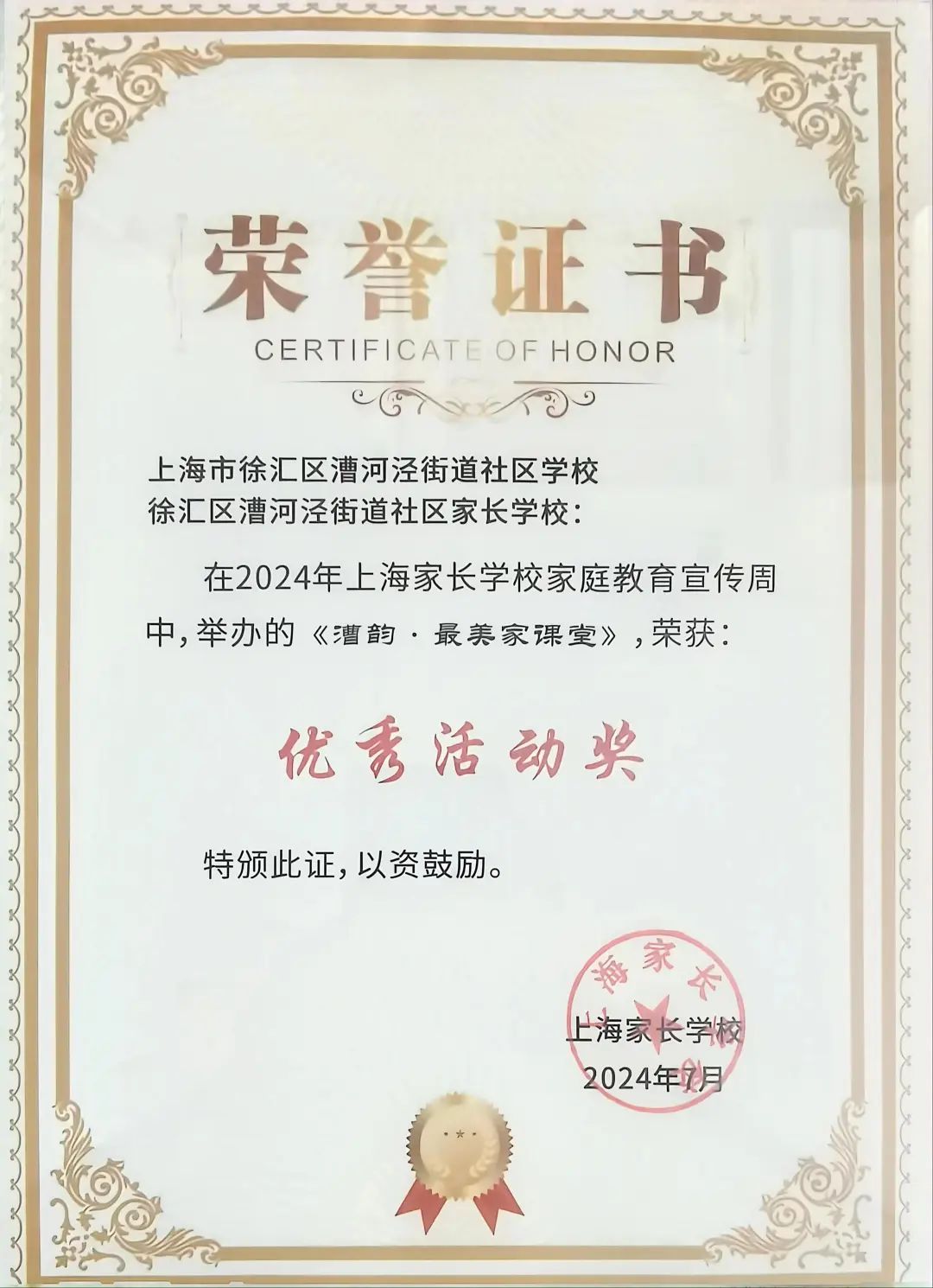 在上海家长学校家庭教育宣传周期间,徐汇区漕河泾街道社区学校的《漕韵·最美家课堂》项目以其创新的教育模式,荣获“优秀活动奖”。