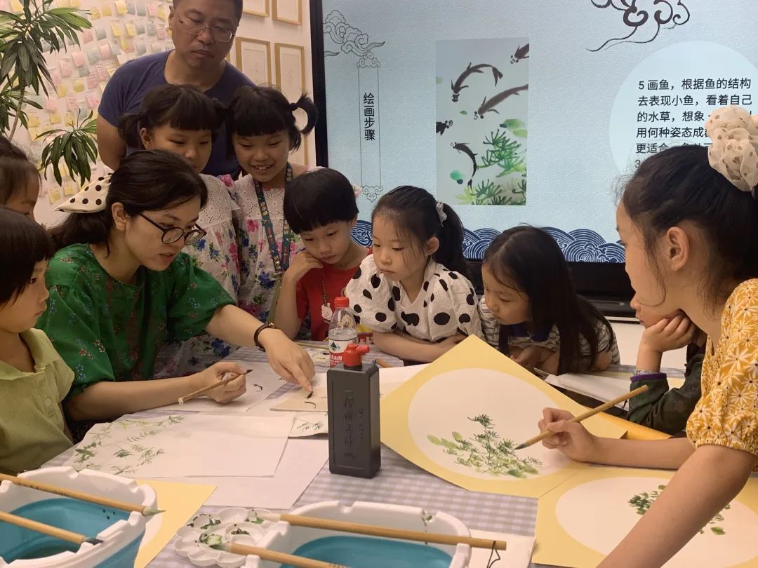 通过在宣纸上的多遍练习,孩子们逐渐找到了画国画的感觉,郑重地在镜片纸上一笔一划地画水草、鱼群,最后在画作右侧落款。