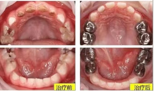 根管治疗后的乳磨牙,因牙齿失去营养,质地变脆,在使用过程中容易发生断裂,金属预成冠可以很好地保护脆弱的剩余牙体组织,延长了乳牙的使用寿命。