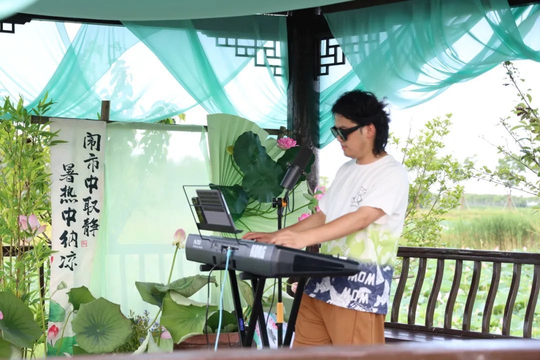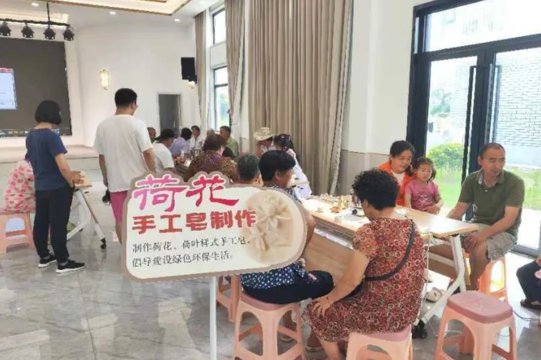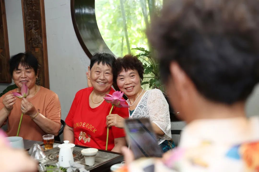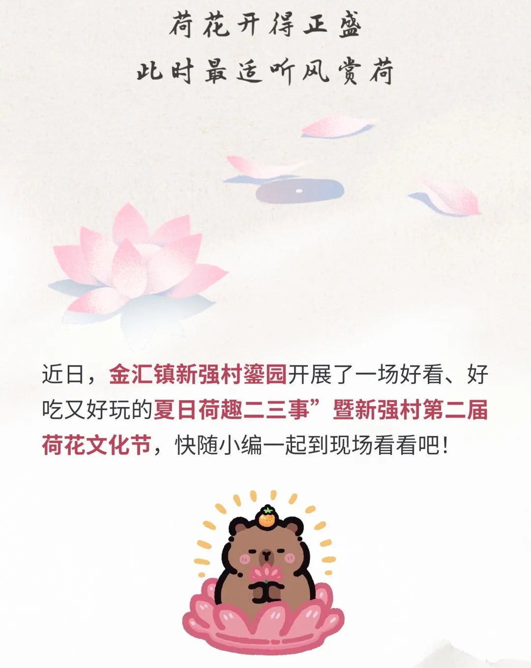 盛夏听风赏荷花,金汇镇新强村鎏园的荷花已然盛势开放。7月20日,“夏日荷趣二三事”暨新强村第二届荷花文化节正式展开。荷花在中国传统文化中具有团圆、好运、清廉高洁等多重寓意,村民通过荷花文化节学习、感悟荷花的寓意与精神。 鎏园里的荷花是村民们一手栽种的,新强村作为平移点,村民通过一起劳作迅速拉近了彼此的联系、增进了邻里之间的感情,村民们一起为了建设美丽的新家园而努力。 荷花文化节也是大家交流的契机。今年,多家企业入驻新强村,不少伙伴也通过“田野朋友圈”爱上了这个村,纷纷表示想成为“新”村民。他们也作为主理人参与了此次活动,“新”老村民们相聚在鎏园,一起在亭亭清荷、袅袅荷香中听风、赏荷、唠家常。 荷花浑身都是宝,本次荷花文化节充分发挥荷花观赏价值、实用价值、精神价值,以荷韵、荷香、荷美、荷悦、荷御、荷乐为题,分别围绕荷花进行摄影、品香、写生、艺术表演等活动,村民们通过亲身体验更加深刻地感受到荷花的韵味。 荷韵 池塘中的荷花清新隽永、纤巧雅致,引得大家纷纷掏出手机、相机,用自己独特的视角记录荷花的美,大家的摄影作品也被布置成展,向更多人分享着自己镜头下的荷花。 受大家热情的感召,微笑照相馆也开始“营业”,在鎏园打造一个沉浸式的荷塘景观造景,免费为大家拍照,记录下美好瞬间。你看!他们笑得多甜! 《浮生六记》中记载:夏日荷花初开时,晚含而晓放,芸用小纱囊撮条叶少许,置花心,明早取出,烹天泉水泡之,香韵尤绝。 这便是广为人知的芸娘荷花茶,以此法泡茶,茶叶会沾满荷花的香,别有一番风味。 现场大家以荷·茶为主题,品味着杯中佳茗,炎炎夏日,仅凭茶香即可清凉人心,阿姨们品尝后都连连称好。茶余之际,阿姨们就着优美的品茗环境,以荷花为道具开心地与小姐妹拍照。 都道“人间有味是清欢”,荷花品质高洁、气息淡雅清新,大家在现场制作荷花样式的中式糕点,体验中国式的浪漫、享人间清欢。 阿姨们运用荷花的色彩制作非遗漆扇,当粉色与绿色的染料交织晕染在漆扇上,扇面上没有荷花,却又似盛满了荷花。此外,阿姨们还创新了色彩的搭配,烟雨江南、敦煌飞天……大家不禁举着自己的作品,来回欣赏。 现场,大家制作了荷花、荷叶样式手工皂,虽是简单的步骤,做出来的手工皂却栩栩如生,让大家收获了满满的快乐。 荷悦 “山川知夏,岁华灼灼”,荷花甚美,通过一场集知识性、趣味性、互动性、实践性于一体的探荷研学之旅,小朋友们了解了荷花、荷叶、莲蓬的构造,并将美丽的荷花通过自己的画笔勾勒、保存。 利用荷叶进行扎染,将荷花最天然的颜色留存在绸缎上。阿姨们不禁感叹,在家门口就可以做出这么好看的扎染。 荷御 《群芳谱》中评价荷花,“凡物先华而后实,独此华实齐生”。荷花全身都是宝,根、叶、花、果无一不可入馔,正巧到了荷花盛开的时节,便以荷为宴、顺时而食。 在荷花夜宴上,大家品味着关于荷花的各种美食,惬意地与身旁的小伙伴唠家常,主理人也与志愿者在夜宴中共话新强村自治工作。 荷乐 在现场有驻唱歌手进行演唱,荷花在嗅觉、视觉、触觉、味觉满足大家,而音乐填补了大家在听觉上的享受,将现场氛围烘托得更加热烈。 看到如此丰富多彩的活动 心动不如行动 在盛夏的热情中 趁荷花正盛开 让我们共赏满塘风荷 在夏日微风中 与荷花来场约会吧!