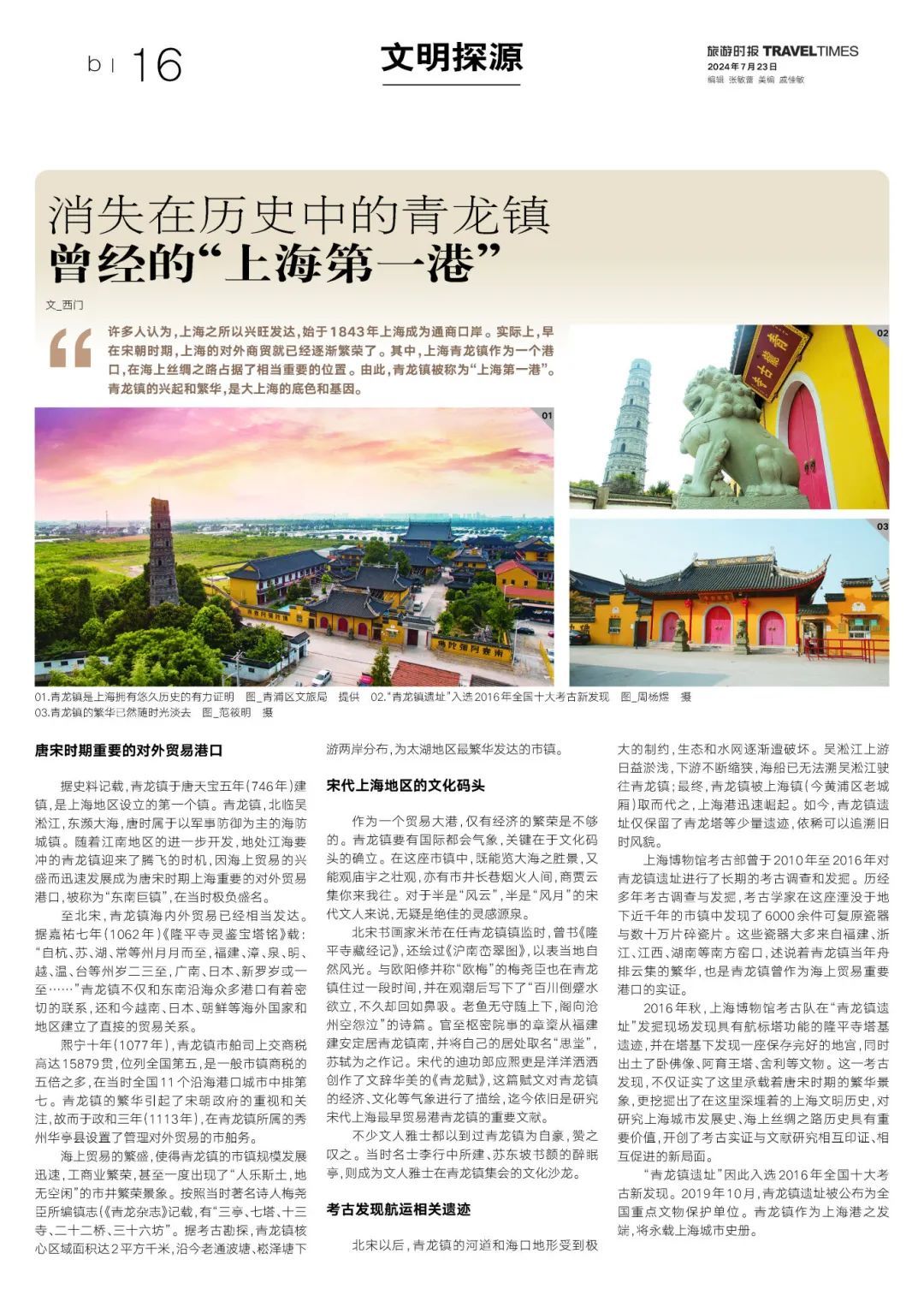 “青龙镇遗址”因此入选2016年全国十大考古新发现。2019年10月,青龙镇遗址被公布为全国重点文物保护单位。青龙镇作为上海港之发端,将永载上海城市史册。