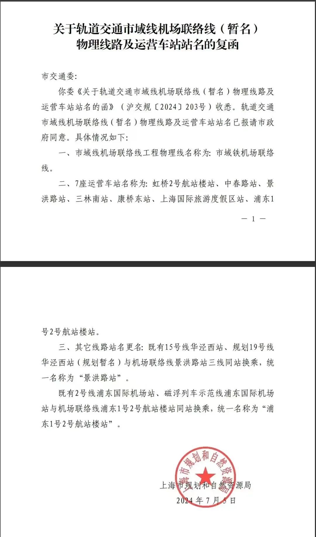 日前,上海市规划和自然资源局发布了市交通委提出的关于轨道交通市域线机场联络线(暂名)物理线路及运营车站站名的复函。其中提到,轨道交通市域线机场联络线(暂名)物理线路及运营车站站名已报请市政府同意。市域线机场联络线工程物理线名称确定为市域铁机场联络线,7座运营车站的名称也已明确,另有部分线路站名更名。虹桥2号航站楼站、中春路站、景洪路站、三林南站、康桥东站、上海国际旅游度假区站、浦东1号2号航站楼站。既有15号线华泾西站、规划19号线华泾西站(规划暂名)与机场联络线景洪路站三线同站换乘,统一名称为“景洪路站”。既有2号线浦东国际机场站、磁浮列车示范线浦东国际机场站与机场联络线浦东1号2号航站楼站同站换乘,统一名称为“浦东1号2号航站楼站”。