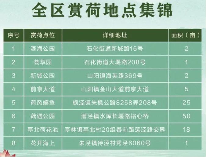 据介绍,全区赏荷点位包括荟萃园、新城公园、荷风嬉鱼等八个区域,赏荷面积达100余亩。期间还将开展廉政讲座、党纪学习教育活动、水生植物知识小课堂等,通过打造“廉盈滨海”绿化市容“公园+”特色工作品牌,弘扬传统文化与廉洁正气,丰富公园为民服务内涵。