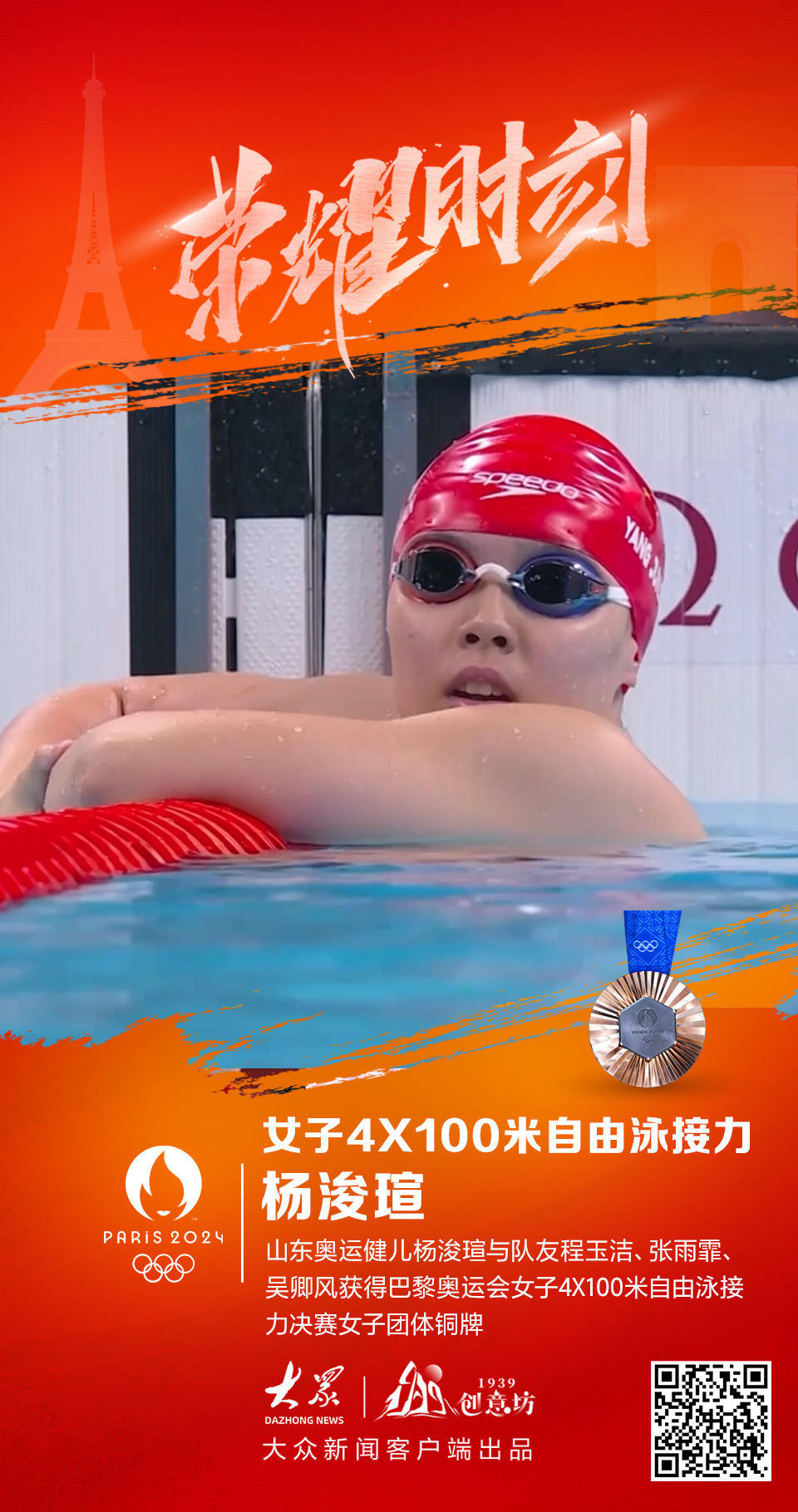 北京时间7月28日凌晨,在巴黎奥运会女子4x100米自由泳接力项目决赛中,中国队收获一枚铜牌。四位站上领奖台的姑娘中,有一位来自山东淄博的姑娘杨浚瑄,这也是山东健儿在本届奥运会上收获的第一枚奖牌。