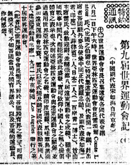 吴一涵等志愿者查询到,1928年9月11日《申报》刊登了宋如海发回的见闻,明确记载这次会议之中,国际奥委会主席“正式提及请吾国代表鼓励吾国人士”派遣运动员参加1932年在美国举行的奥运会。《申报》开设了“第九届世界运动会记”专栏,刊登宋如海从阿姆斯特丹发回的多篇“特约通讯”。