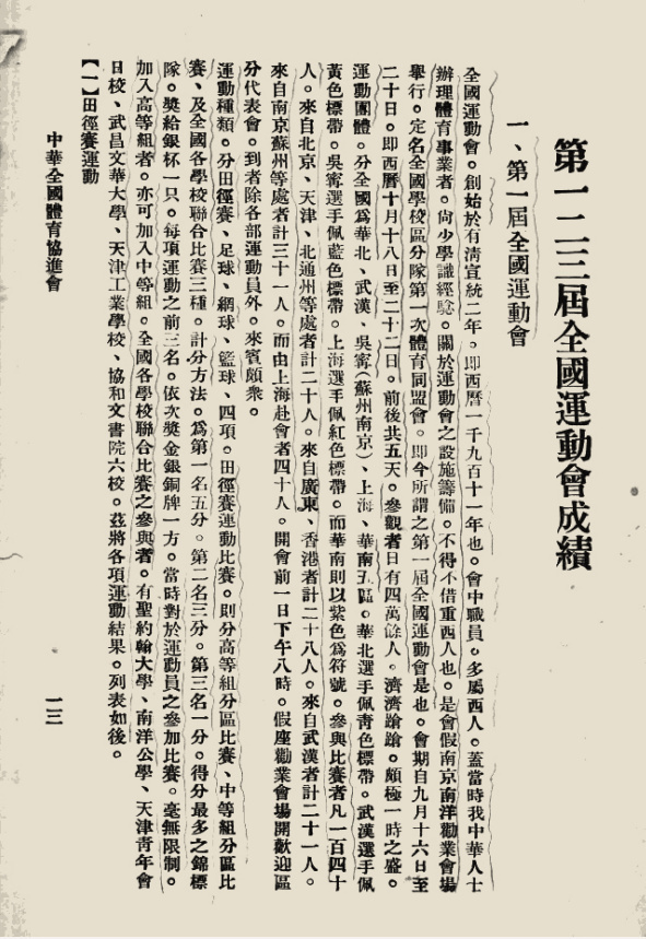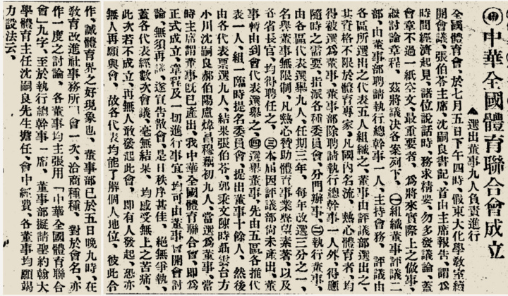 1924年7月,又是在南京,“中华体育联合会”在东南大学化学教室成立,其倡议者包括中国现代体育事业的先驱张伯苓、王正廷等人。由此,中国第一个合法的全国性体育组织正式成立,这是中国体育史上里程碑式的重大事件。不久之后,该会更名为“中华全国体育协进会”。