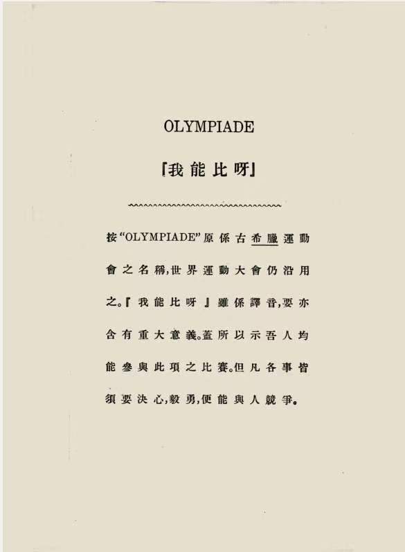 在这本书里,宋如海将法语里表示“奥林匹克”的单词音译,由最早的“阿灵比亚”改成“我能比呀”。他在书中这样告诉读者:“‘Olympiade’原系古希腊运动会之名称,世界运动大会仍沿用之。‘我能比呀’虽系译音,亦含有重大意义。盖所以示吾人均能参与此项之比赛。但凡各事皆需要决心、毅勇,便能与人竞争。”
