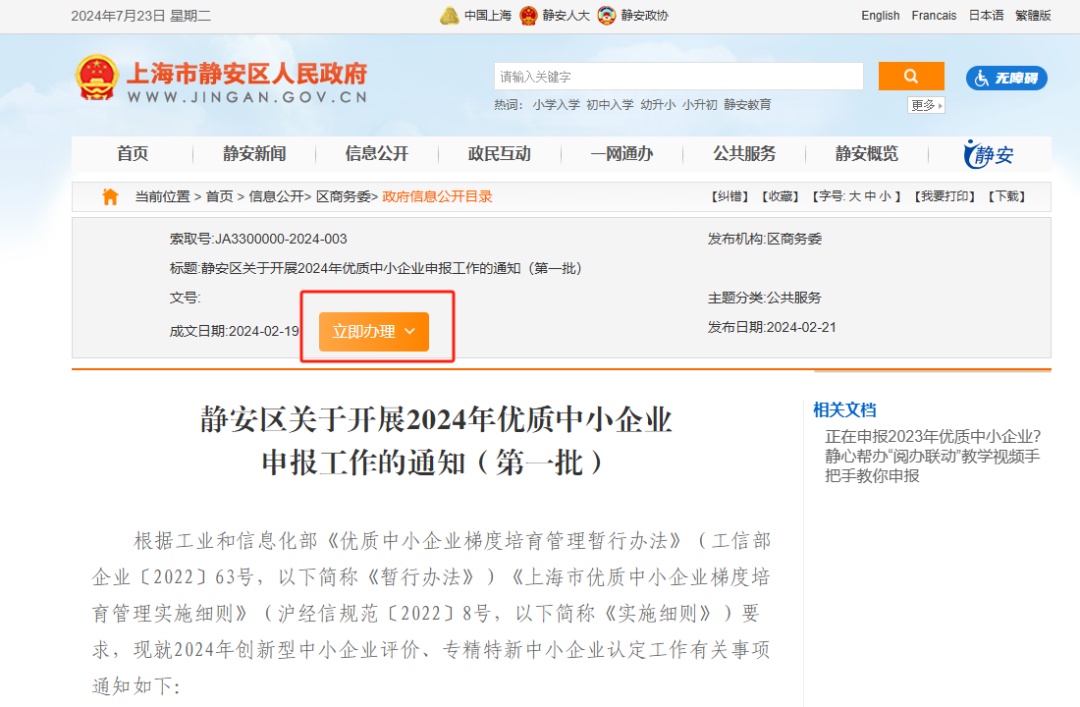 在此基础上,建立政策“阅办联动”机制,门户网站政策原文页面增加了显著的“立即办理”按钮,可直接跳转到办事页面,实现一键通达。目前,共梳理出22份文件,实现25个办事事项“阅办联动”。
