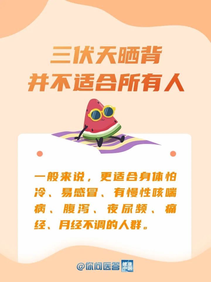 起到防病健体的效果。但是,三伏天晒背并不适合所有人。今年三伏天高温加暴雨,