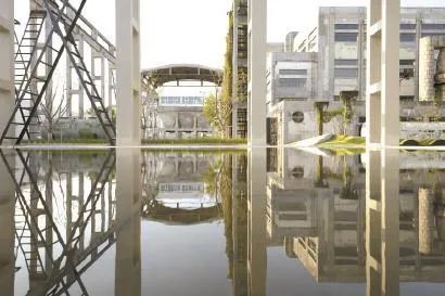 每个地标都有故事。比如,“镜像花园”来自与玻璃艺术家王沁的合作。花园深处的白色玻璃屋恍如幻境,似乎能照见另一个自己。著名诗人欧阳江河写下的长诗《海上得丘》,被镌刻在园区的墙面上:“时间会不会从烟囱底部开始松动/拔地而起的海岸线遗迹/以考古学眼光看,曾是阔视的大海/人间被石头垒砌到天上时/烟云供养已是盘根错节/坐一念一,精神将蒙恩于尘土……”