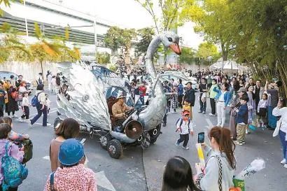 上海国际插画艺术季活动中,马良制作的天鹅花车在园区里巡游