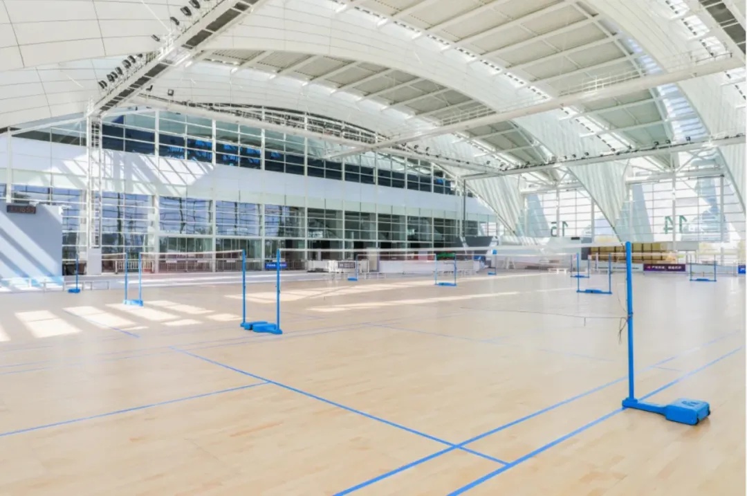 总面积达39906平方米,拥有多座运动场馆,篮球和羽毛球作为大众运动,受众也相当多。火星篮羽中心的篮球和羽毛球场地均为赛事级,地面符合CBA国家赛事的标准。在现场,我们还可以看到可卸的羽毛球场地地胶和电动升降式的篮筐,兼顾了日常休闲和体育赛事的需求,非常有趣。