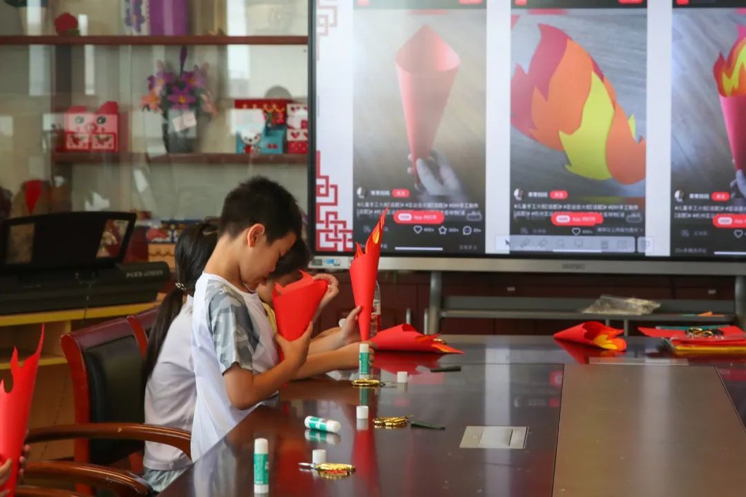 在剪纸教室内,孩子们用橙色和黄色的卡纸剪出锯齿状的火苗,再用彩纸卷成蛋筒状,固定成型后,做成了一把自制火炬。在粘土教室内,大家开动脑筋,捏出了一件件带有奥运元素的手工创意粘土作品。