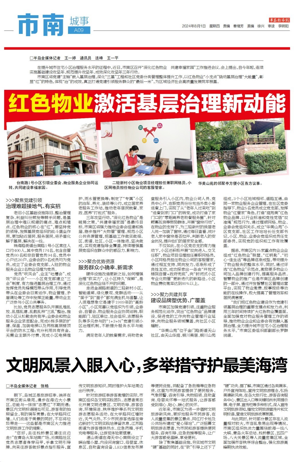 市南区将党建“主轴”嵌入基层治理,深化“三基”工程和社区党委分类管理整体提升工作,以红色物业“小支点”撬动基层治理“大能量”,彰显“红”的特色,体现“治”的成效,真正打通党建引领服务群众的“最后一米”,为区域经济社会高质量发展筑牢根基。