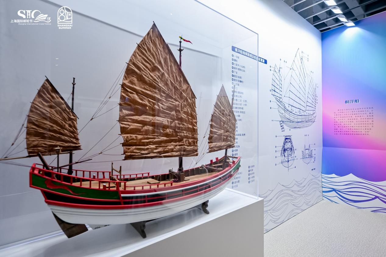 展厅另一边的邮轮船模展和邮轮摄影展包含了华夏国际邮轮有限公司、皇家加勒比游轮公司、MSC地中海邮轮公司、招商维京游轮公司、蓝梦国际邮轮公司提供的邮轮模型以及邮轮主题摄影作品。值得一提的是,中国航海博物馆借出的横洋船模型,为清代往来台海两岸的贸易帆船。通过邮轮摄影展和邮轮船模的展陈,人们能够一站领略各家邮轮公司的深厚历史与独特文化,以及它们在探索广袤世界进程中所作出的卓越贡献。