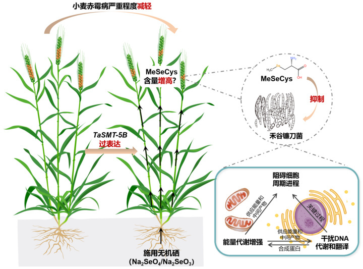 扬州大学农学院李韬教授团队经过多年的研究,发现了可以通过合成甲基硒代半胱氨酸提升小麦赤霉病抗性的关键基因——TaSMT,并在此研究基础上,携手扬州大学化学化工学院俞磊教授团队共同开发了一种制备成本低、硒生物强化效果好的生物强化制剂——甲基硒葡萄糖。这些发现为硒生物强化和赤霉病防治提供了新思路和新方法。