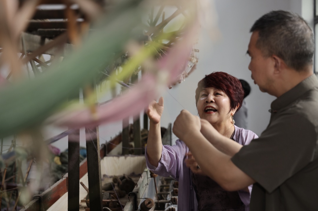 从2018年开始,金山丝毯厂还将旧车间改造为“非物质文化遗产保护传承基地”及“社会研学实践教育基地”。期间,程美华研发出“数码可移动机台”,将原本2米多高的传统机台微缩成一张A4纸大小,降低了丝毯技艺的门槛,让学生等爱好者更方便亲近、体验、学习丝毯编织的传统技艺。