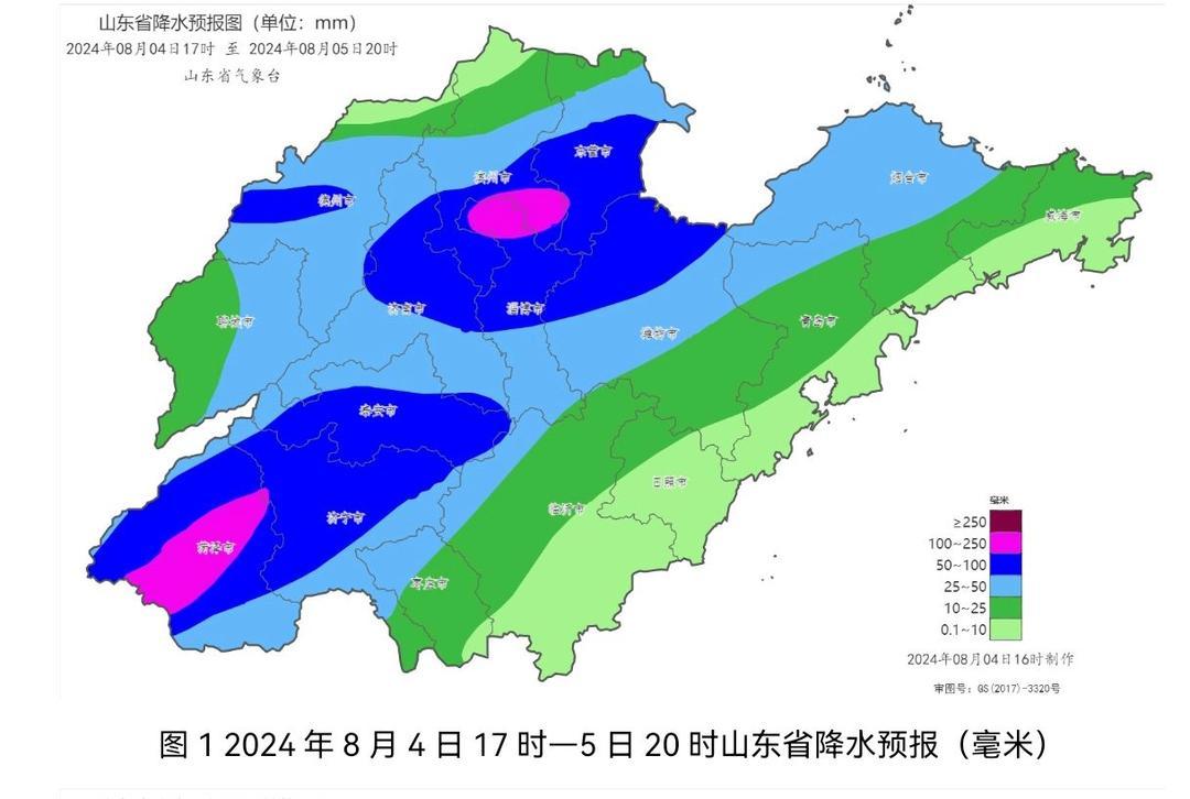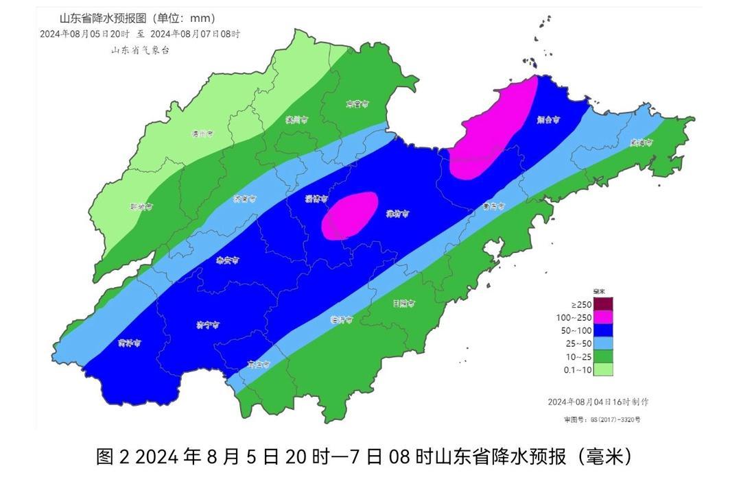 4日傍晚至5日白天,德州、滨州、东营、菏泽、济宁、泰安、济南、淄博、潍坊北部和烟台北部有大到暴雨局部大暴雨(40~70毫米局部150毫米以上),其他地区有雷雨或阵雨。