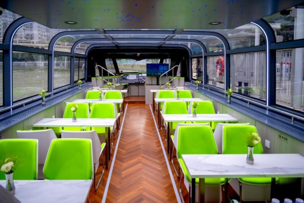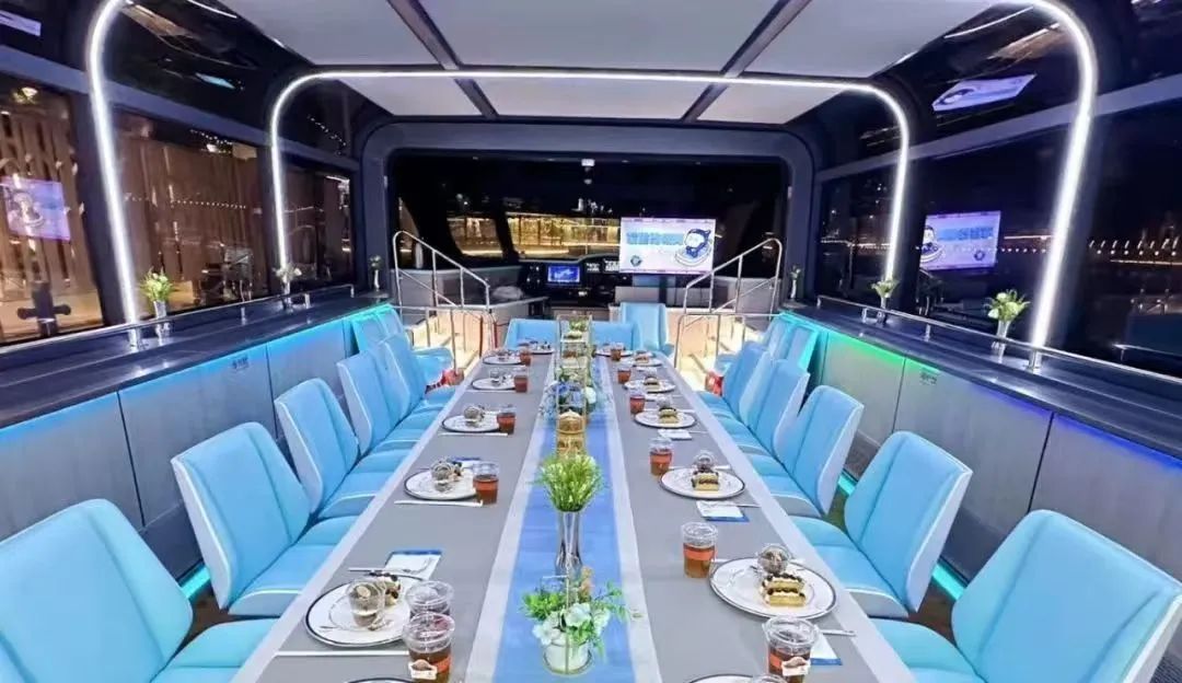 功能提升打造多元化体验场景。游船内部的桌椅布局可灵活变换,形成多种场景模式,还精心融入了休闲娱乐及小食酒水服务,为游客提供多元化的场景空间和服务体验。