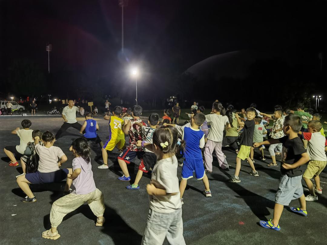 “快快快,先压腿,个子高的在北边,矮一点的在南边,够不着的小朋友,还是在路牙子上……”8月3日晚8时,在菏泽市郓城县龙泽湾小区旁的广场上,70余位孩子们正在“师傅”的口令下准备武术课前的热身动作。