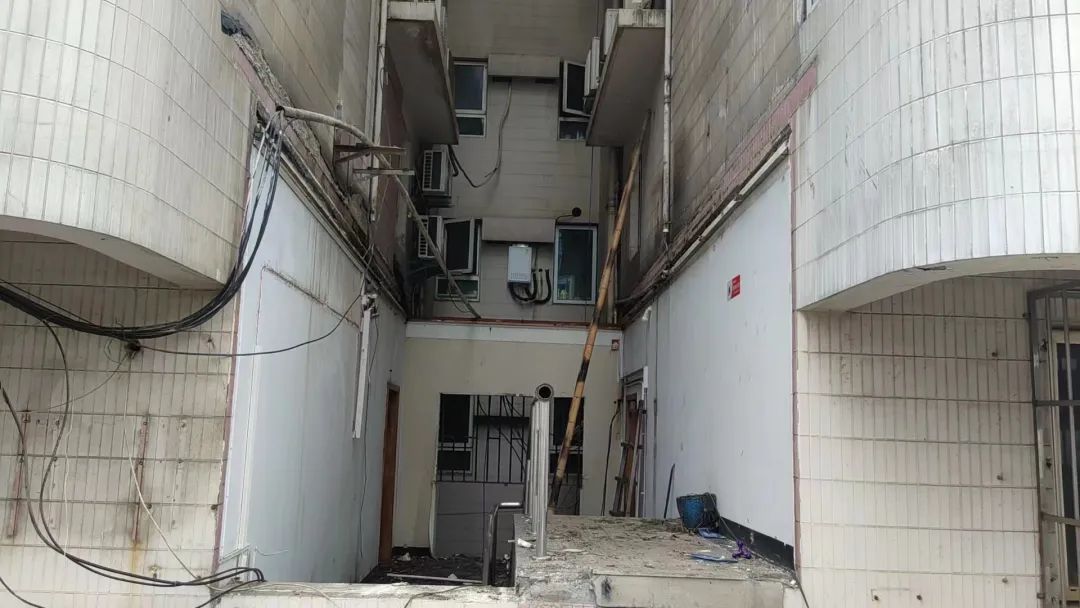 由于裙房与大楼无直连通道,当时为保障办公正常使用,便在裙房与大楼之间搭建了该彩钢板建筑物,作为通道使用。该通道属违章搭建,后被纳入拆违点位库。
