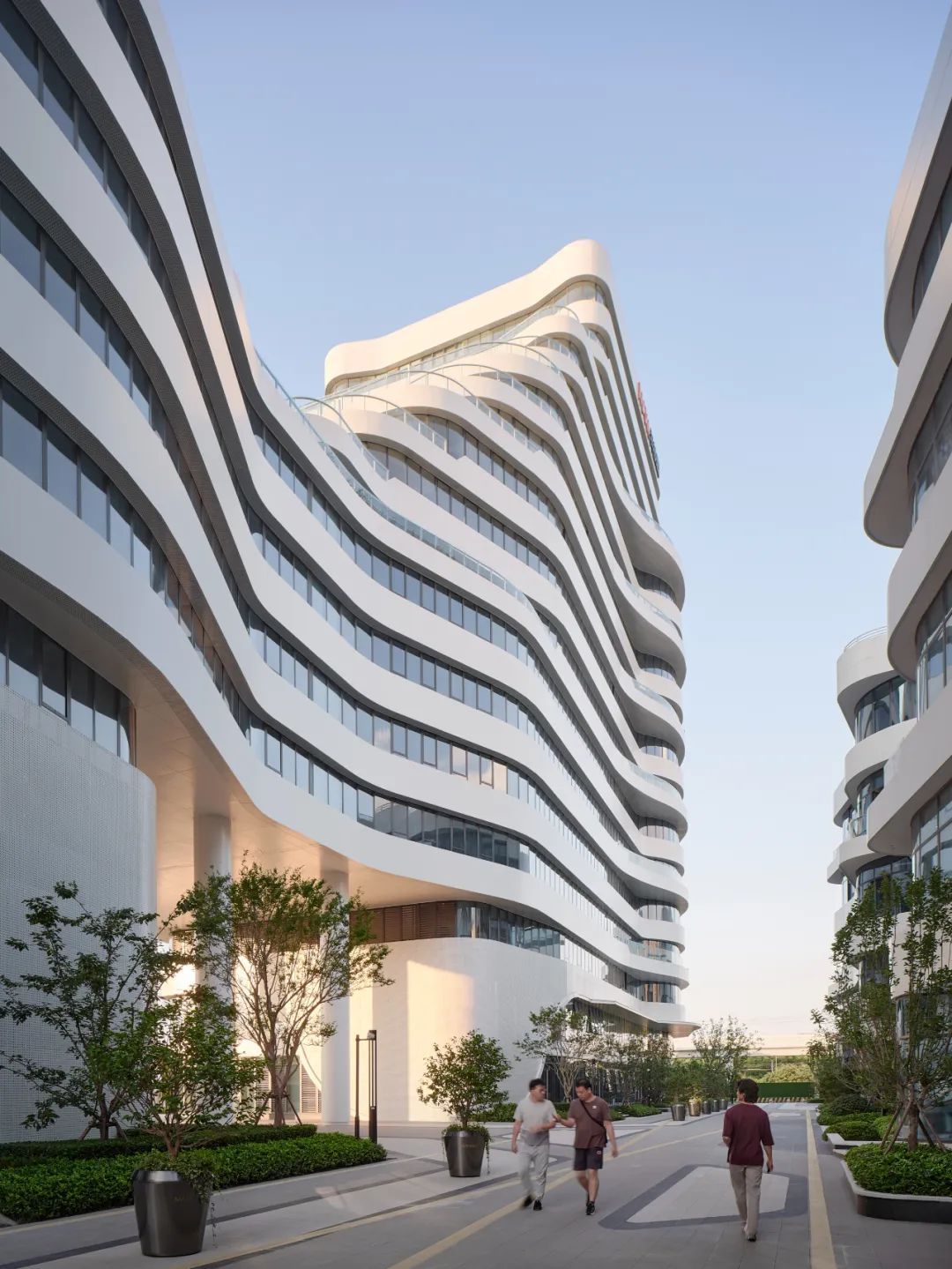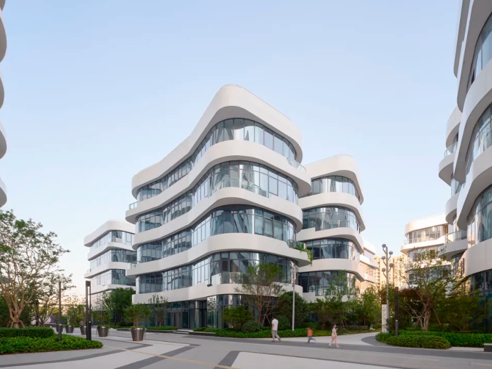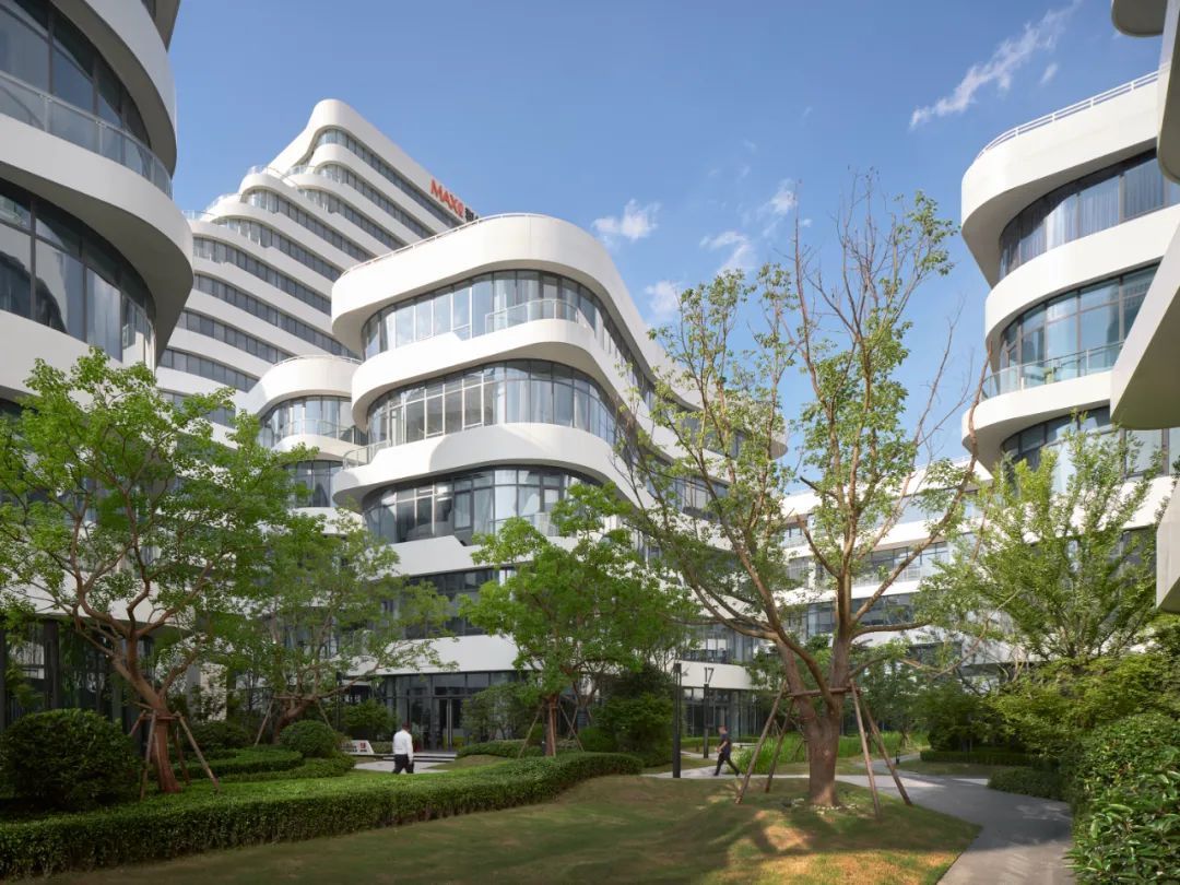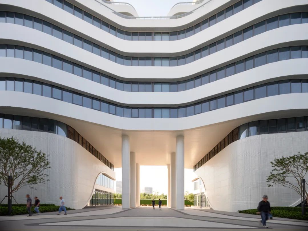在建筑设计上,每栋单体建筑的外立面由似“山谷”峰峦叠嶂、富有韵律的白色曲面构成,打破了传统科创园区方正死板的造型特征。