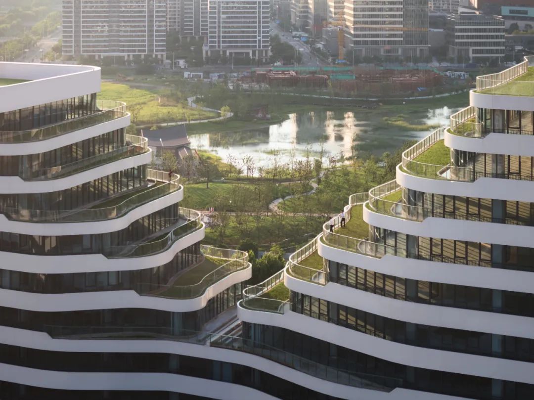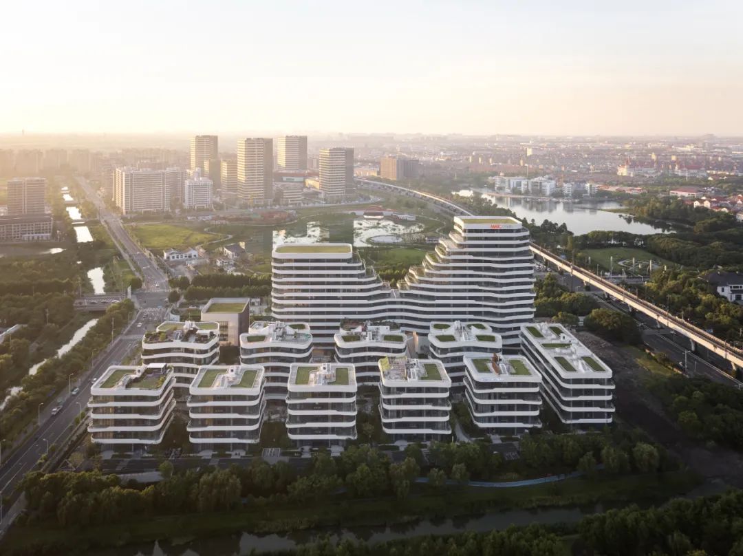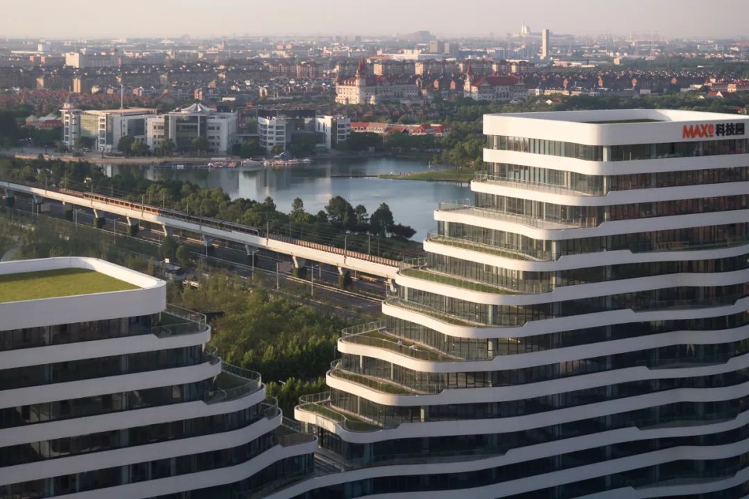 由HATCH汉齐建筑事务所操刀规划和建筑设计的MAX科技园上海·美兰湖,打破这种刻板印象,塑造与周遭生态景观相连、富有动态与开放性,并配套以餐饮、公寓及休闲健身设施的智慧科创社区。