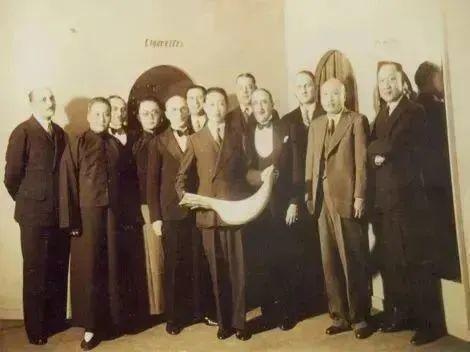梅兰芳(中)手持回力球拍。此图摄于天津回力球馆